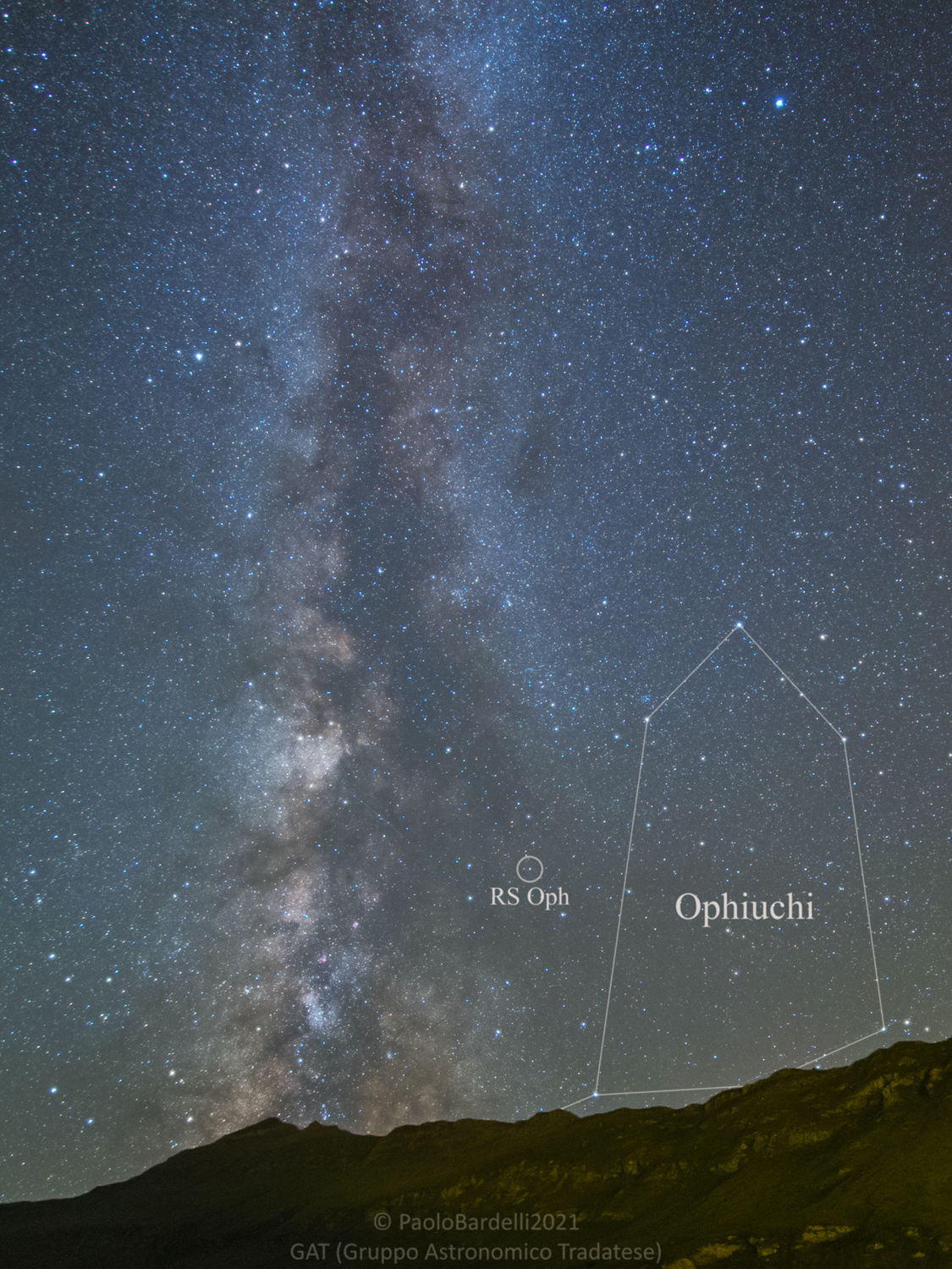 La nova ricorrente RS Oph, che ogni 15 anni circa passa dalla magnitudine 11 alla 4-5, ripresa appena dopo l’outburst in un’immagine a largo campo dal cielo pulito del Passo del Moncenisio in Francia.