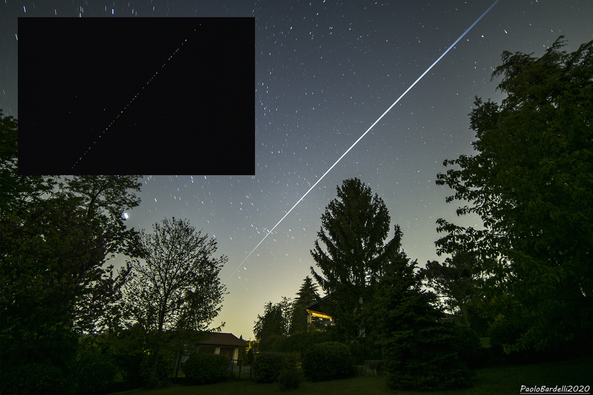 Un passaggio incredibile dell’ultimo treno di satelliti Starlink, il sesto, una fila compatta di punti molto luminosi per una lunghezza paragonabile a quella del Piccolo Carro. Non ho mai visto nulla di simile, nessuna immagine può rendere quanto la visione ad occhio nudo di questa sfilata di oggetti artificiali, sicuramente scambiata da osservatori occasionali come una flotta di astronavi aliene… Dovremo purtroppo abituarci a scene come questa.