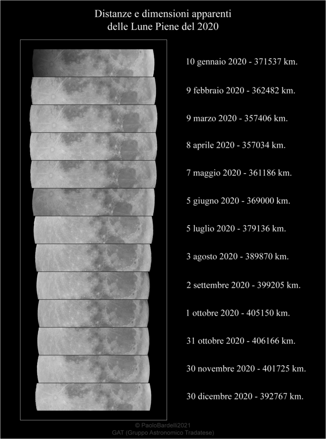 L’anno scorso sono riuscito a fotografare tutte le 13 Lune Piene. Le immagini, riprese con uno zoom 70/300 mm. a 300 mm. su treppiede, sono state tutte orientate correttamente rispetto al meridiano, trattate allo stesso modo, ritagliate e impilate per rappresentare le variazioni delle dimensioni apparenti del nostro satellite, in relazione alla distanza dalla Terra, e le librazioni, che ci consentono di poter osservare il 59% della sua superficie. Le "fette" del 10 gennaio e del 5 giugno sono più scure perchè in quei giorni abbiamo avuto 2 eclissi di penombra.