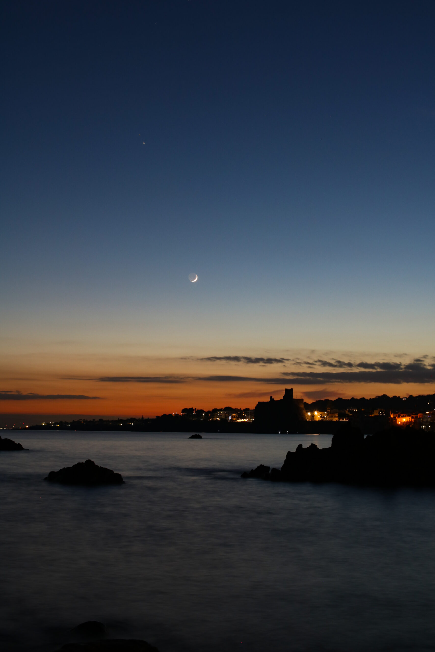 Congiunzione tra la Luna, Giove e Saturno sopra il Castello medioevale di Aci Castello(CT).