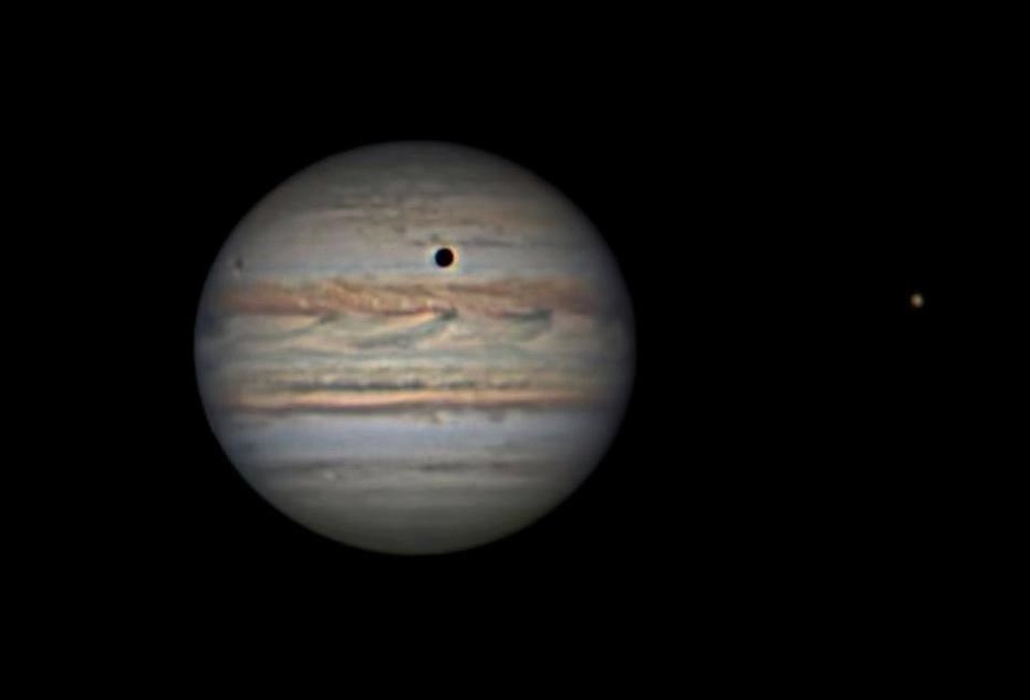 Oltre al satellite Europa si nota il transito dell’altro satellite Ganimede e della sua ombra sul disco,inoltre Giove mostra le sue bande e diversi festoni blu
