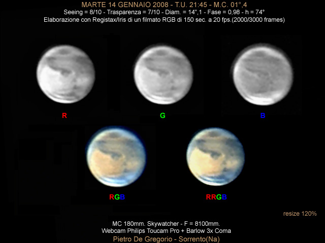 Marte 14 Gennaio 2008 RRGB. Finalmente una serata buona per evidenziare il Sinus Meridiani e le spettacolari nebbie sul pianeta Marte