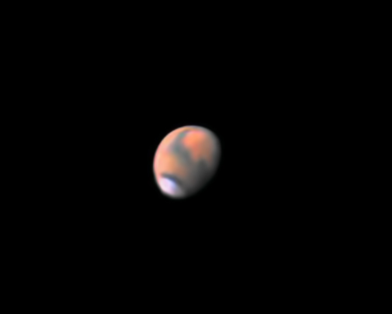 La bellezza del pianeta rosso prossimo all’opposizione con i suoi mari(si nota la Grande Sirte) e con l’immensa calotta polare sud formata da ghiacci di acqua e anidride carbonica