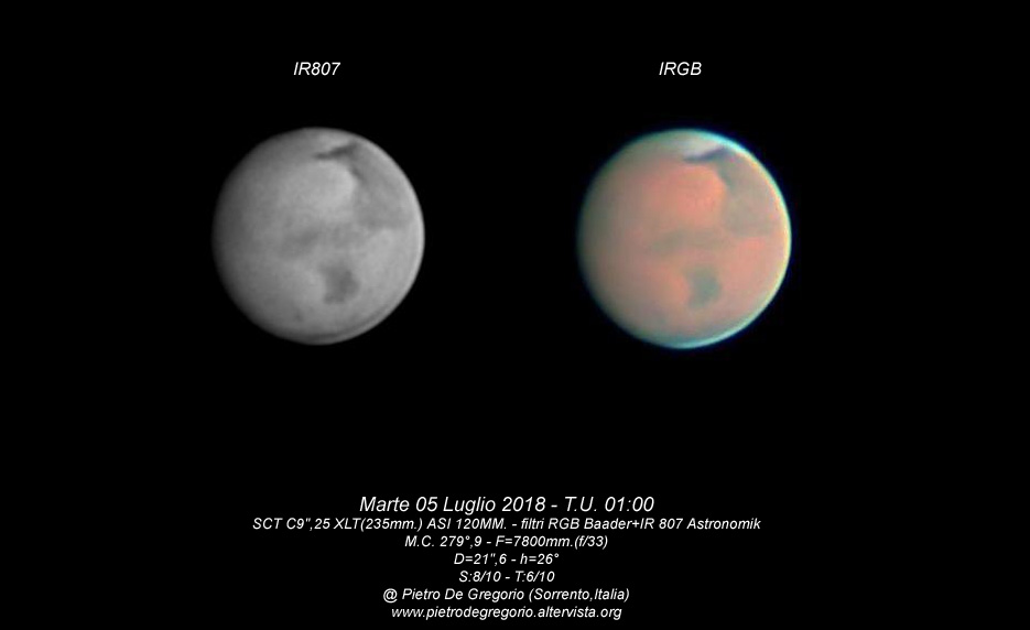 Marte del 5 luglio 2018 sotto un’ottimo seeing,sembra che la tempesta di polvere stia calmando come si vede chiaramente sul globo di Marte che per metà sta schiarendo mentre l’altra metà è ancora oscurata,come anche la calotta polare sud.