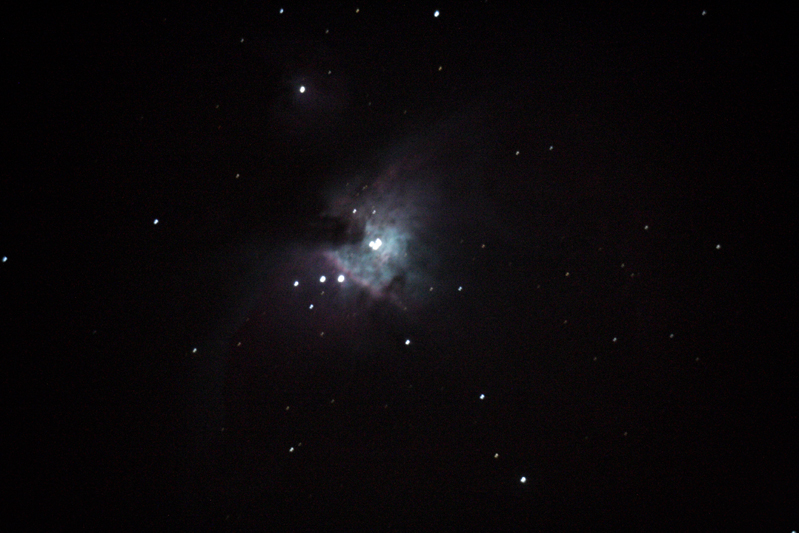 Singolo scatto della Nebulosa di Orione a 1600 iso e 10 sec di esposizione. Acquisita con Canon 350D al fuoco del C8 e modificata con Photoshop.