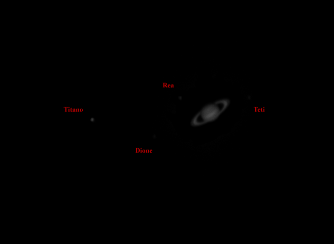 Una vecchia foto scattata l’anno scorso che rappresenta Saturno in compagnia di Rea, Teti, Dione e Titano. Per catturare i satelliti ho sovresposto l’immagine della CCD così da renderli visibili. Dopo aver processato l’immagine, ho usato Photoshop per unire quest’ultima ad una ripresa normale di Saturno ottenuta pochi minuti prima e simulare, quindi, in maniera precisa la loro posizione rispetto al loro pianeta.