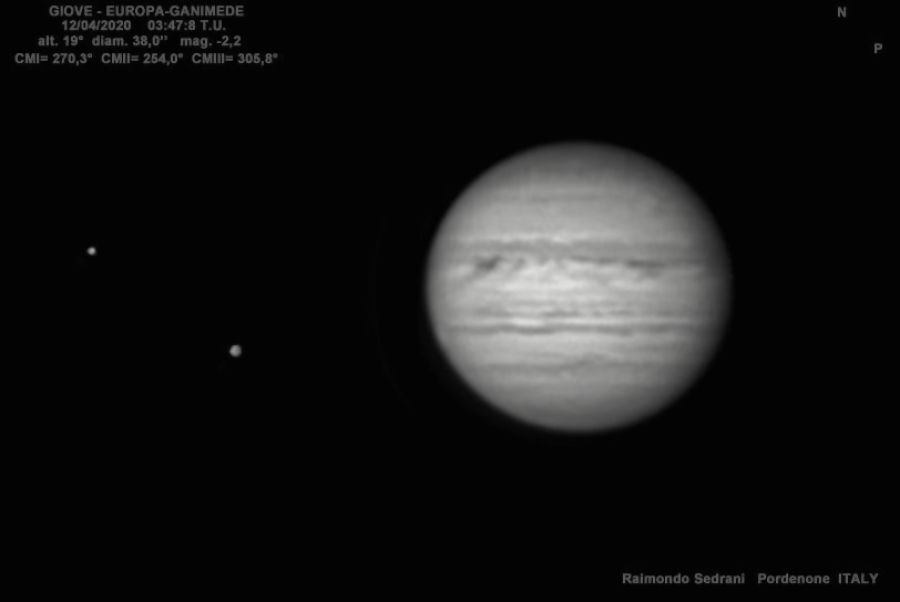 Derotazione di 5 minuti. I satelliti sono stati ottenuti con una elaborazione a parte. Sovrapposizione di 2 immagini. La posizione dei satelliti rispetto il pianeta, non è da considerarsi precisa.
