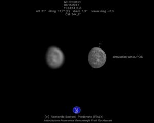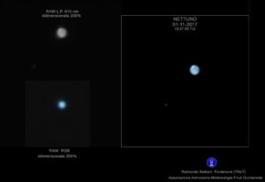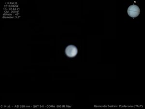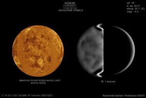 Finalmente! Seeing ottimo come poche (rare)volte capita. L’aberrazione cromatica, in questo caso, dovuta all’altezza(22°)è stata corretta molto bene con l ‘ A.D.C.- Momenti magici ed emozionanti.Il pianeta indimenticabile a 400X, era immobile e pieno di particolari e sfumature di colore. Il tempo di riprendere pochi filmati ed una estesa formazione nuvolosa a messo fine a questo spettacolo.