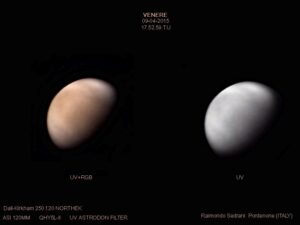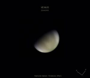 Finalmente! Seeing ottimo come poche (rare)volte capita. L’aberrazione cromatica, in questo caso, dovuta all’altezza(22°)è stata corretta molto bene con l ‘ A.D.C.- Momenti magici ed emozionanti.Il pianeta indimenticabile a 400X, era immobile e pieno di particolari e sfumature di colore. Il tempo di riprendere pochi filmati ed una estesa formazione nuvolosa a messo fine a questo spettacolo.
