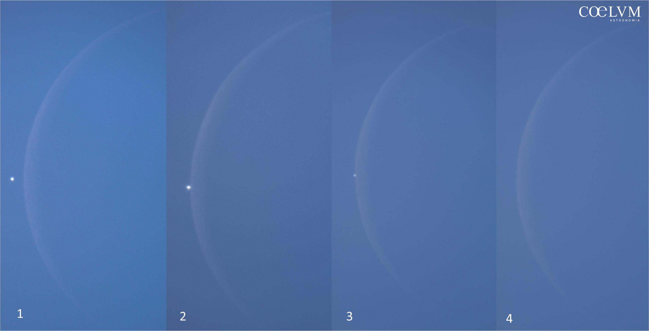 Prima fase dell’ occultazione di Venere da parte della Luna. Una giornata tersa ha permesso di osservare e riprendere magnificamente il fenomeno. Canon EOS 80d al fuoco diretto di un riflettore da 20 cm. F/1000 con correttore di focale 0,6x.