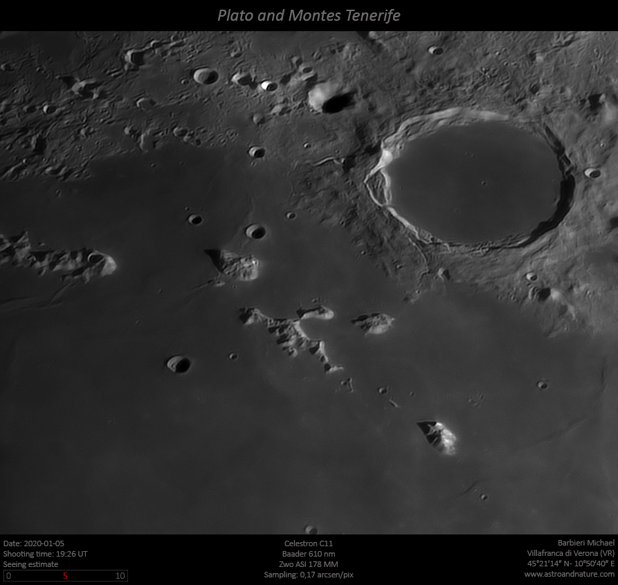 Cratere Plato con sotto i Monti Tenerife, Pico e Monti Recti