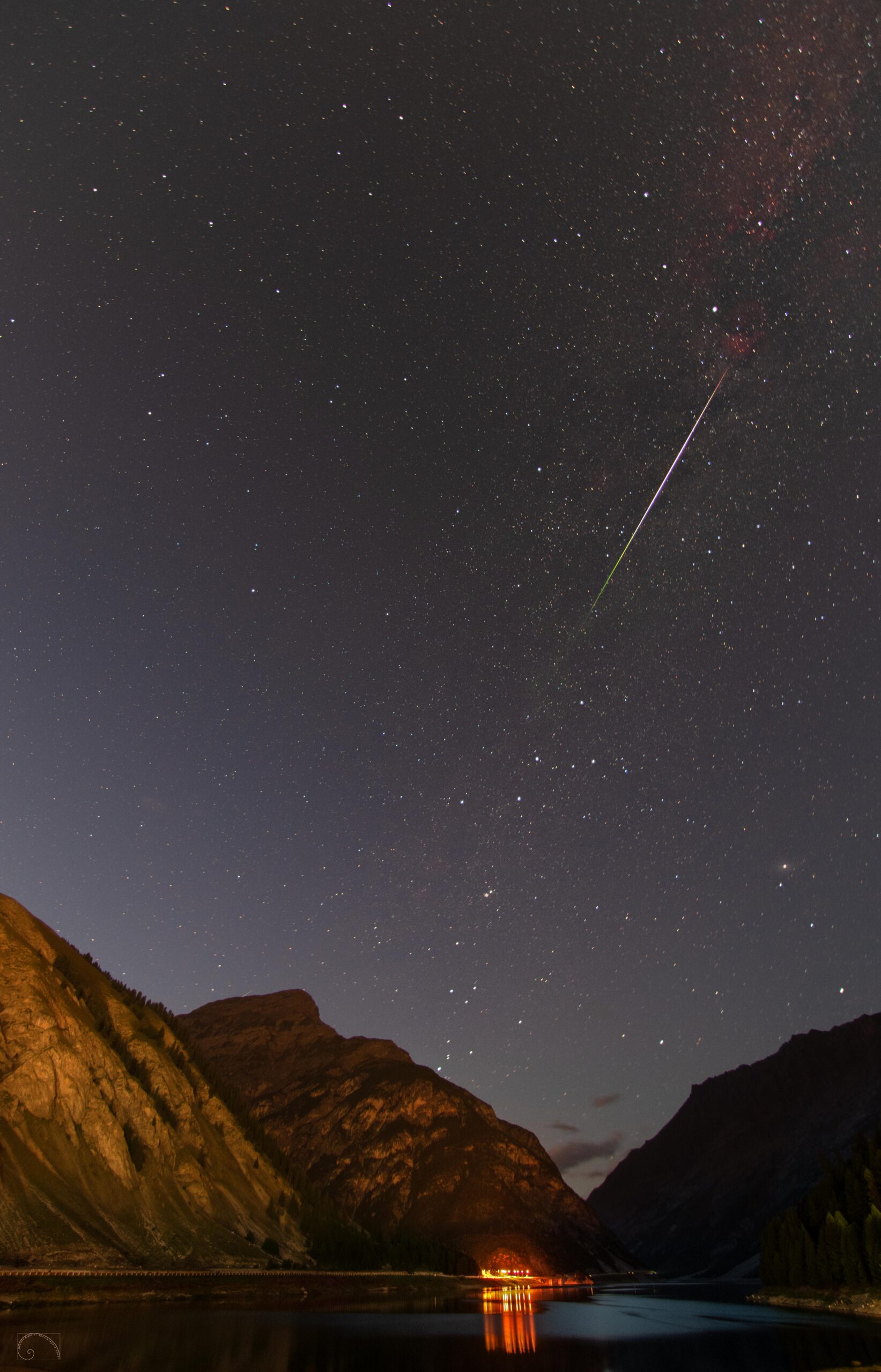 Foto Scattata al lago di Livigno, si tratta di una delle tante foto che stavo facendo per uno star trail e sono riuscito per caso a catturare una perseide, sopra la Via Vattea in alto a destra (nella costellazione del Cigno) ed in diagonale . In basso a destra si vede la galassia di Andromeda, al centro la costellazione di Cassiopea, a sinistra l’ Orsa minore con la stella polare e sopra la costellazione del drago.