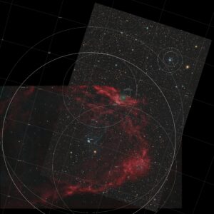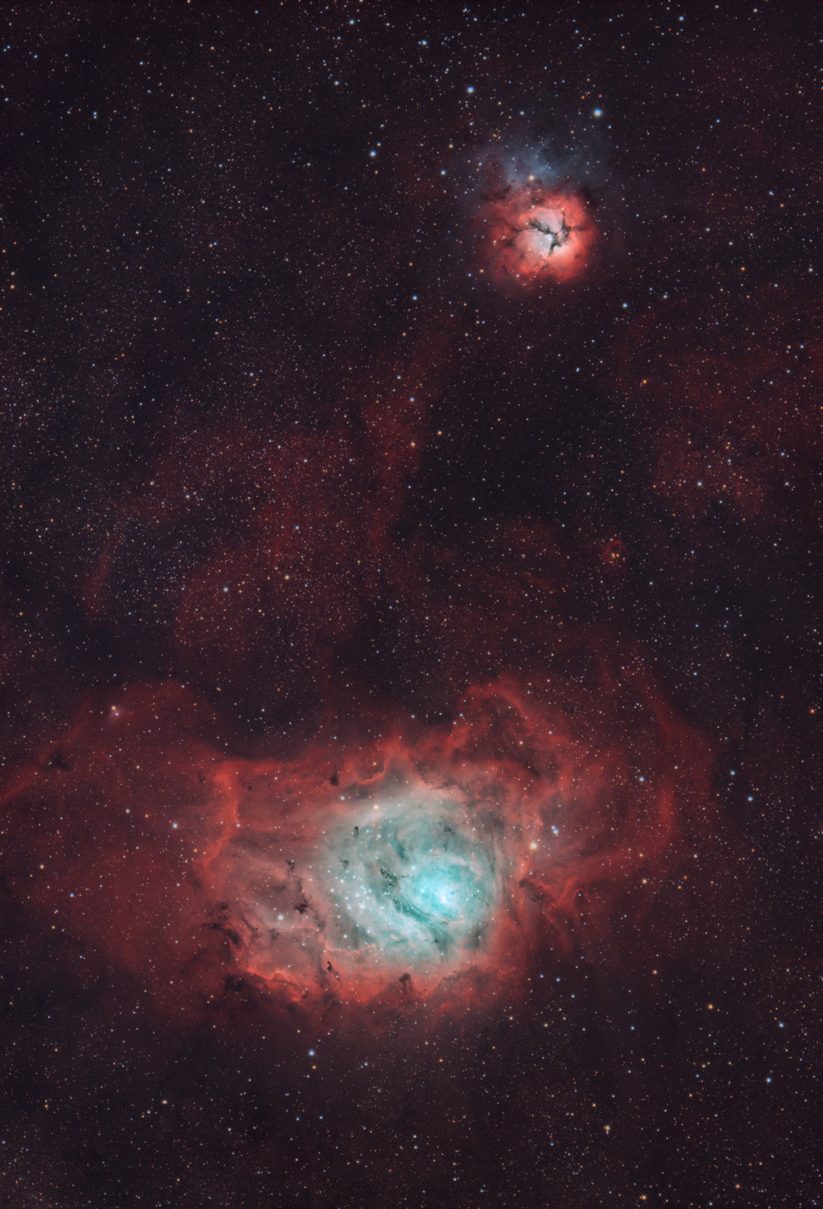 Come vedete si tratta, in basso alla foto la Nebulosa Laguna – M8 soggetto molto luminoso presente nelle prossimità della parte più trafficata della via Lattea, nelle prossimità del centro galattico, purtroppo non visibile a pieno nel nostro emisfero, ma non manca di regalarci molte nebulose e campi ricchi di una moltitudine di stelle. Più in alto, invece, troviamo una nebulosa denominata Trifida – M20, caratteristica fondamentale è sia la linea scusa sulla zona rossa in basso, che si divide in tre parte (tri-fida ), e la nebulosa una riflessione azzurra in alto.