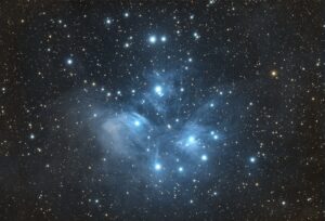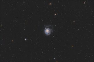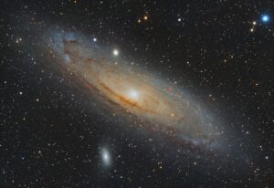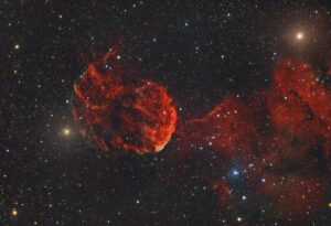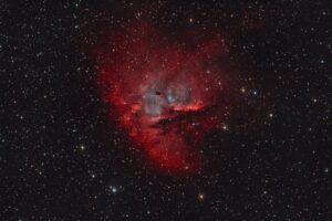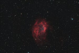 M20 – Nebulosa Trifida è una nebulosa a emissione e una regione H II situata nella costellazione del Sagittario. Deve il suo nome alle tre linee scure di nubi di polvere che la dividono in tre parti. Dista circa 5.000 anni luce dalla Terra, venendosi così a trovare nel Braccio del Sagittario, ossia il braccio di spirale immediatamente più interno del nostro. La singola stella massiva visibile al centro è fonte della gran parte dell’illuminazione dell’intera nebulosa; ha un’età stimata di circa 300.000 anni, che ne farebbe la più giovane regione di formazione stellare conosciuta. Le stelle che eccitano i suoi gas sono giganti blu di classe spettrale O e di magnitudine assoluta pari a -5, dell’età di circa 7 milioni di anni; i vari colori sono dati dai diversi elementi: il rosso è tipico dell’idrogeno, mentre l’azzurro dell’ossigeno. Le bande oscure sono invece polveri e gas freddi e non illuminati.
