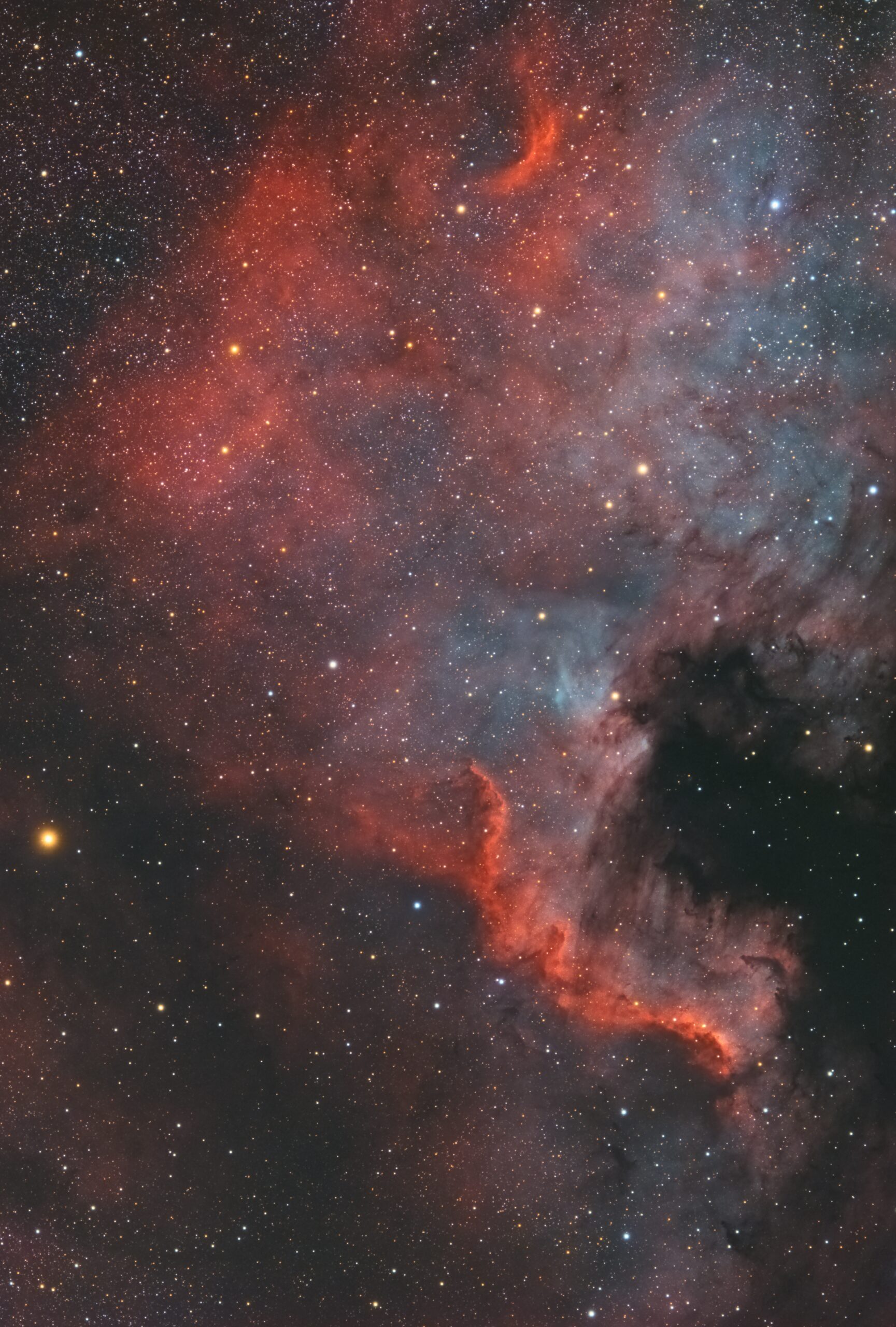 Una delle nebulose più grandi, conosciuta col nome Nord America oppure con la sigla NGC7000. Presente nella costellazione del Cigno. Soggetto molto grande e allo stesso modo non sempre facile per mostrare al meglio le caratteristiche di questa zona, dov’è molto ricca sia in Ha che in OIII, o meglio le zone di OIII si mescolano molto nelle zone di Ha. In questo elaborato è presente anche una sessione con filtro bibanda L-eXtreme e alla aggiunta di una serata in più in banda larga.