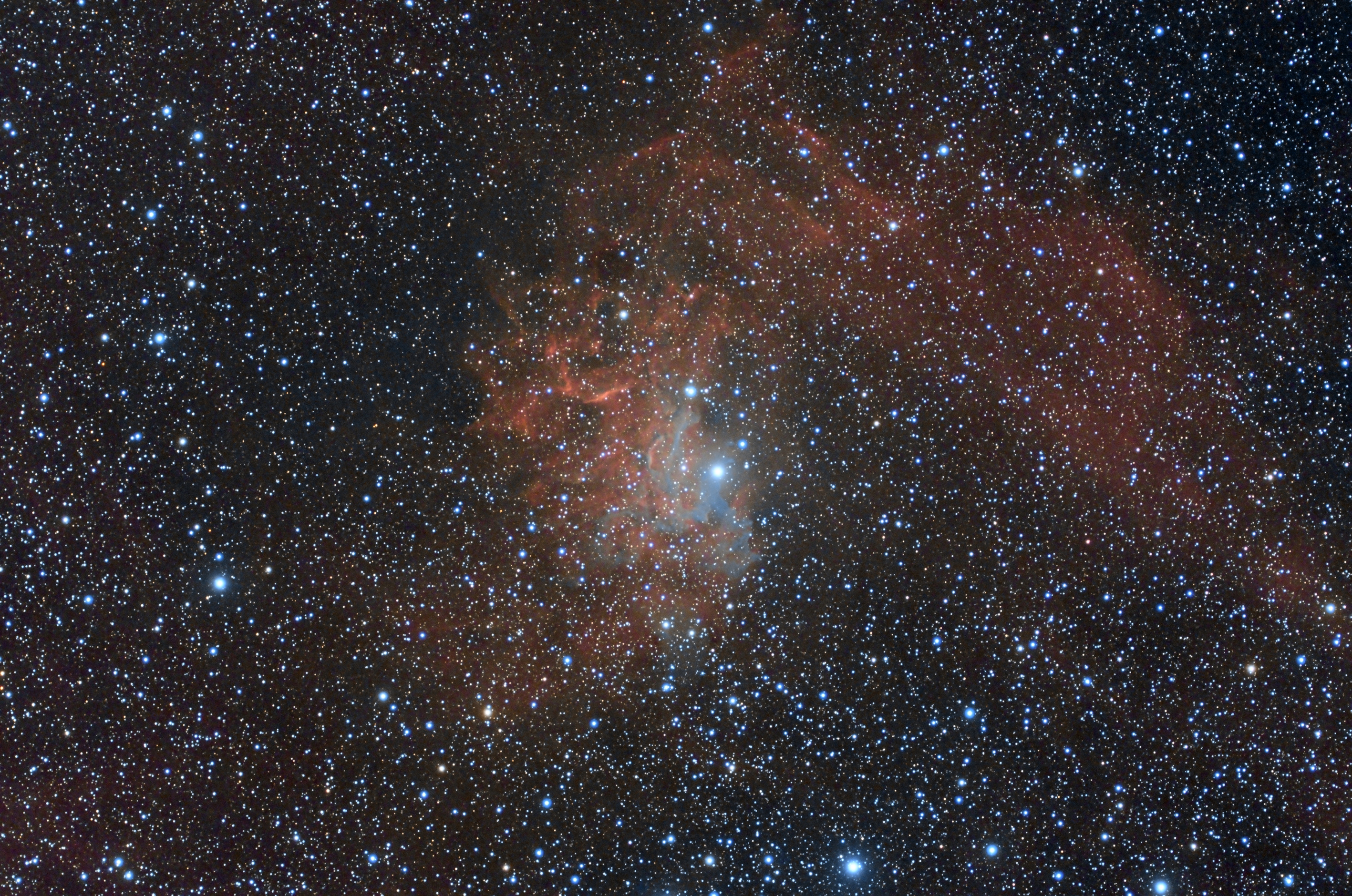 La nebulosa "Stella fiammeggiante" nella costellazione dell’Auriga. La stella che la illumina,"AE Auriga" al centro nella foto, è una massiccia e caldissima stella di tipo O che viaggia rapidamente nello spazio, probabilmente espulsa dalla collisione di un sistema stellare multiplo nelle vicinanze della Nebulosa di Orione, circa 2,7 milioni di anni fa.