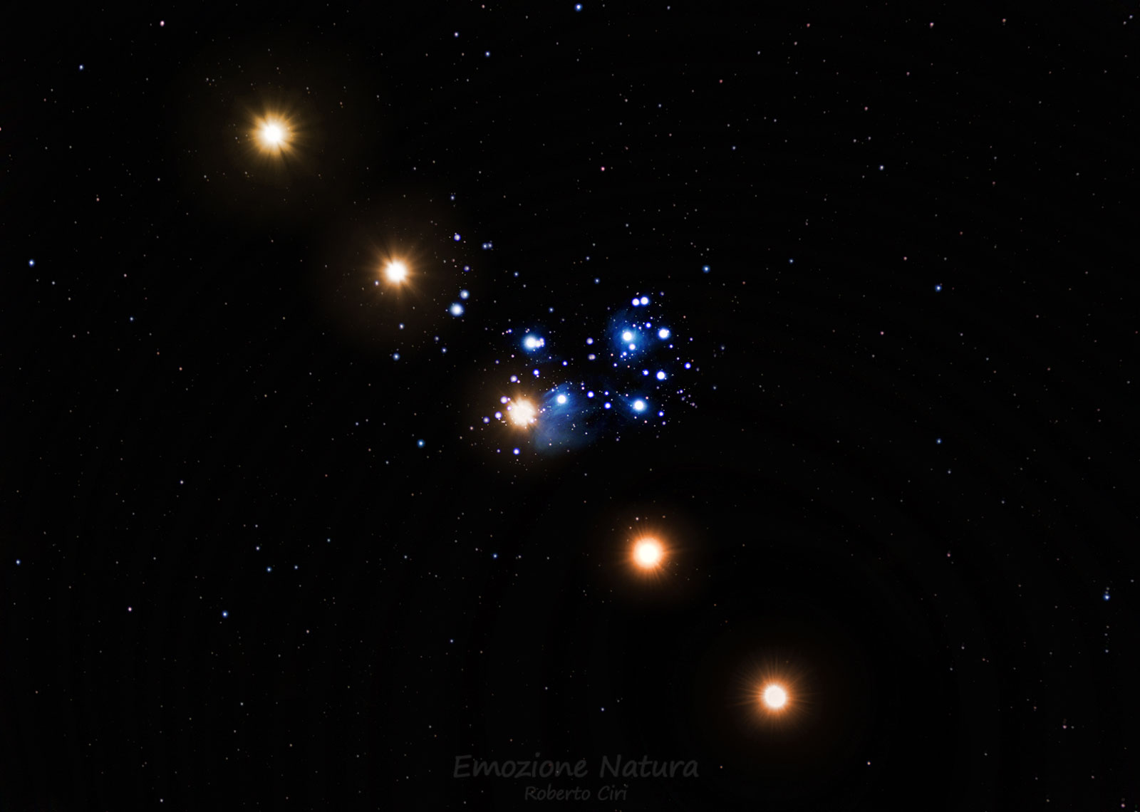 Immagine del transito di Venere davanti le Pleiadi, ripresa dal 1 al 5 aprile 2020 con Nikon D3300 teleobiettivo 70/300 mm a 180 mm e astroinseguitore Minitrack Lx3. Somma di una cinquantina di scatti per ogni sera di ripresa (Deep Sky Stacker) e montaggio con Photoshop rispettando la posizione di Venere in ogni foto. Un transito che si verifica ogni 8 anni e, date le ottime condizioni di visibilità e meteo, era davvero imperdibile! Soprattutto per un "ex astronomo" come me che fotografa le stelle da quando era ragazzino 😉