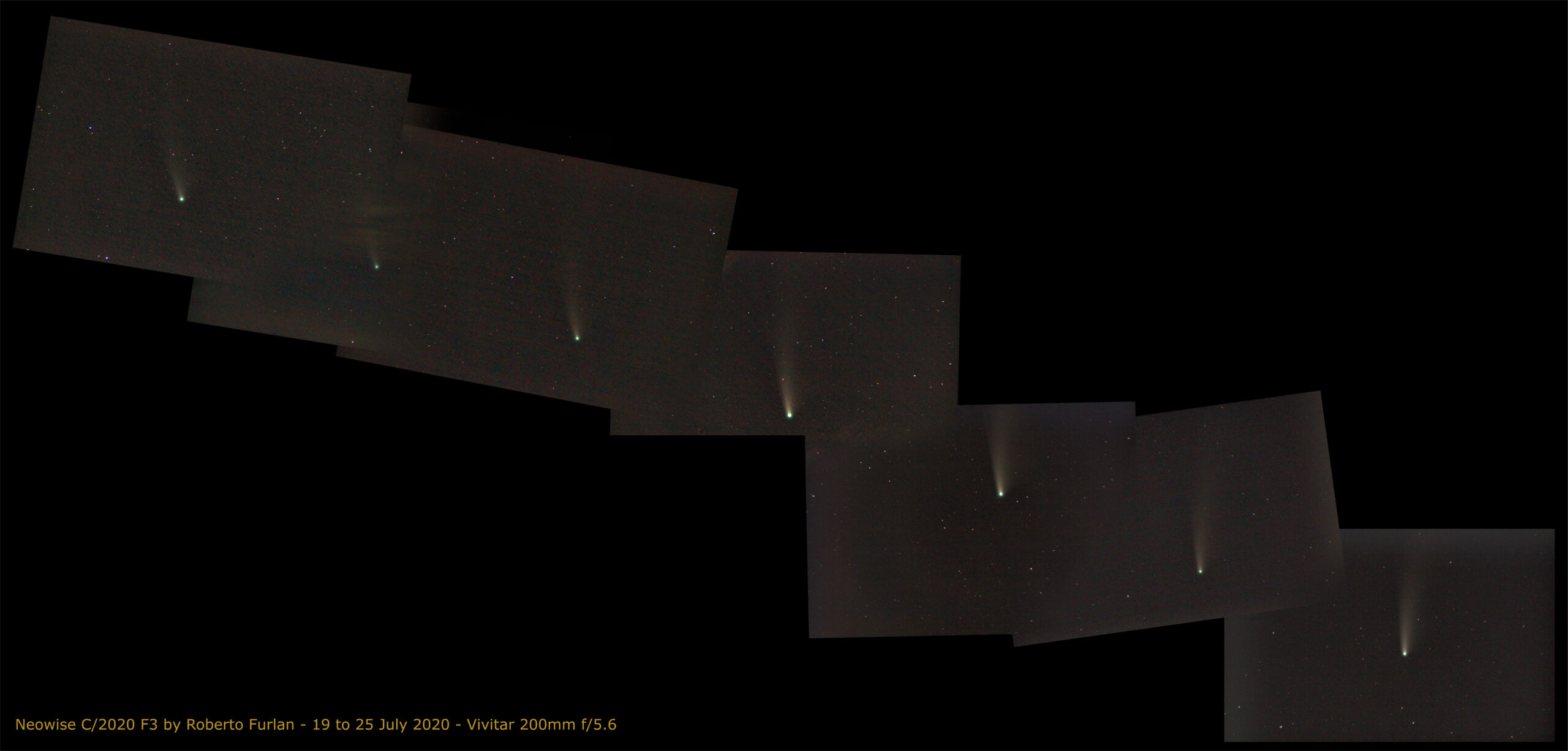 La foto mostra il movimento nel cielo della cometa Neowise C/2020 F3 sopra i cieli di Londra, ripresa nelle giornate 19-25 Luglio 2020 con una Canon EOS 1300D e obiettivo Vivitar 200mm f/5.6. Il giorno 24 era nuvoloso, ma la cometa si riesce comunque ad vedere. Composizione di circa 120 immagini.