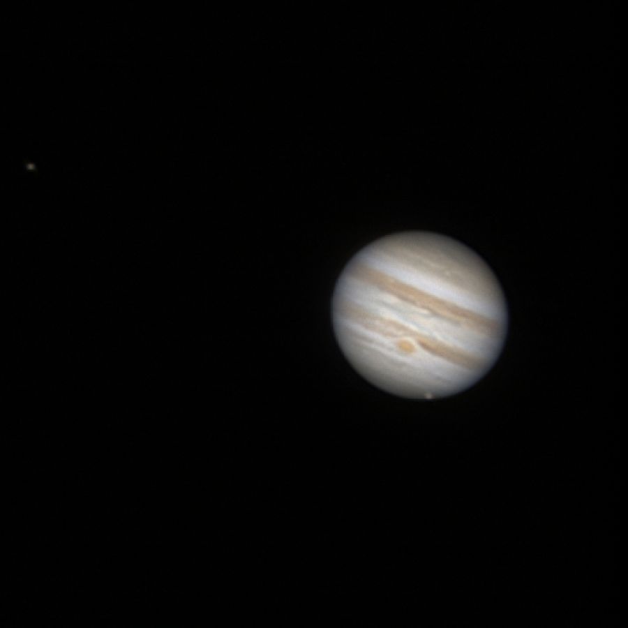 Questa immagine mostra il gigante gassoso con Ganimede nel bordo sud del pianeta e l’altro satellite Io più in alto a sinistra.