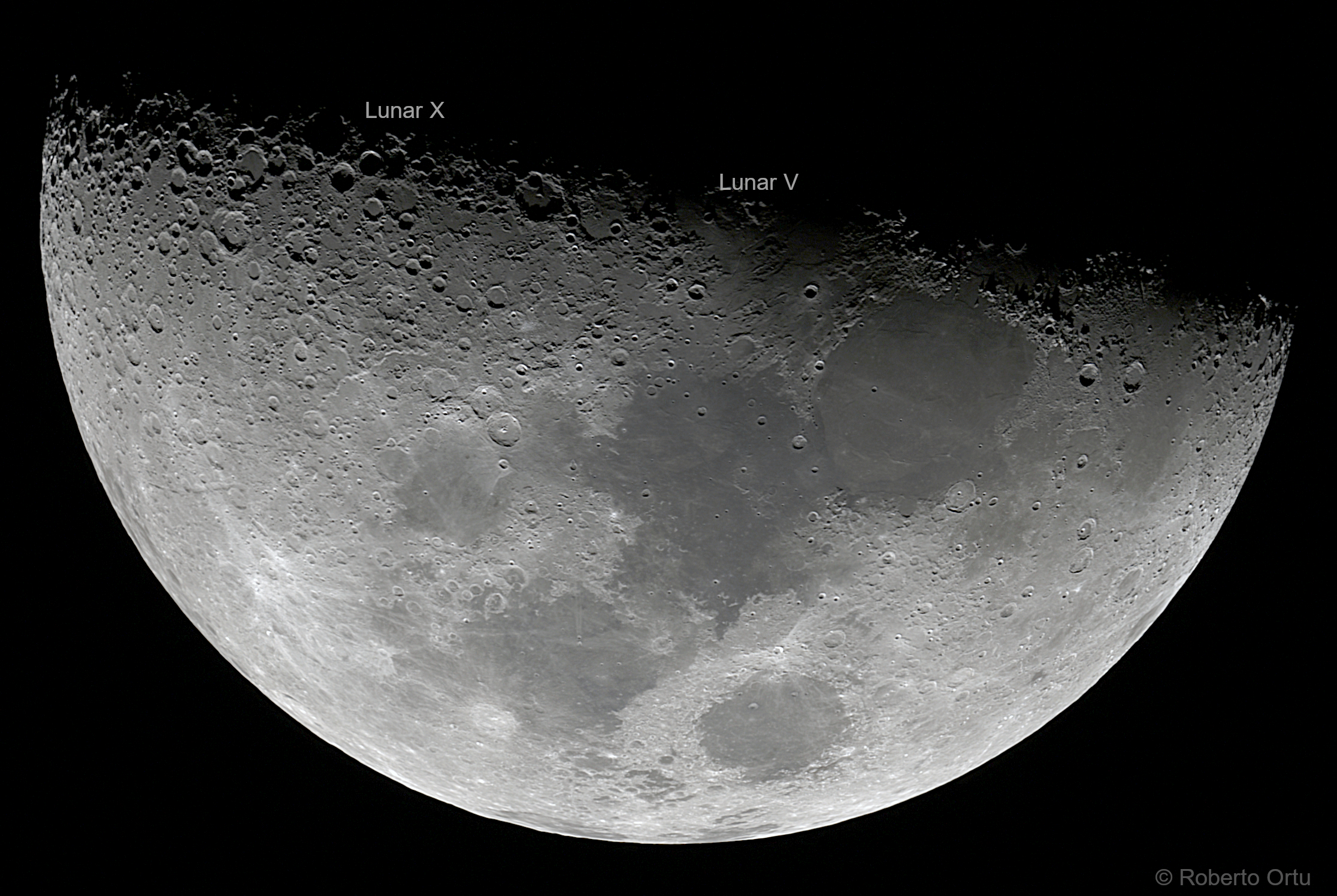Quando la Luna è prossima al primo quarto si possono osservare una lettera X e una lettera V lungo il terminatore.