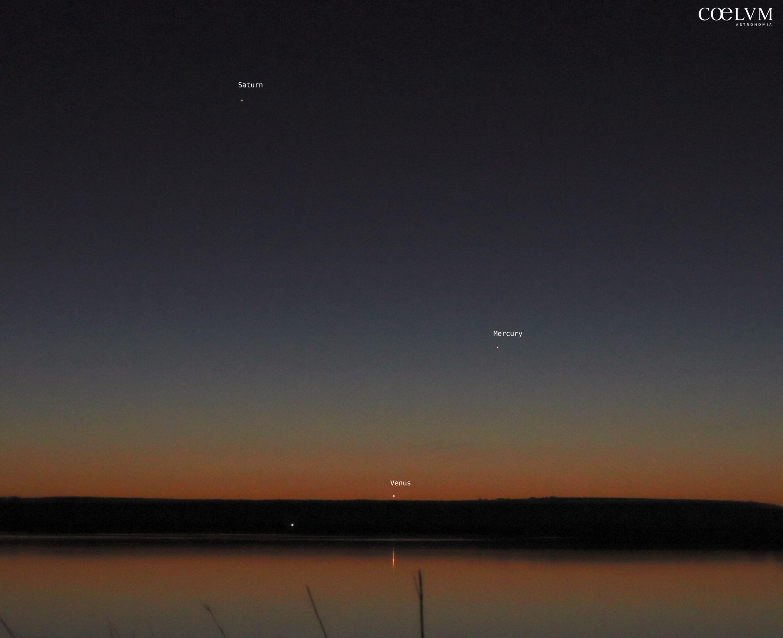 Questa è una foto dei tre pianeti visibili durante il crepuscolo che ho scattato la sera prima della congiunzione. In ordine di altezza abbiamo quindi Venere vicina al tramonto, Mercurio e Saturno. Si vede bene anche il riflesso del pianeta Venere sull’acqua dello stagno. Ho fatto un crop alla foto originale e ho corretto leggermente l’esposizione. Canon EOS R100 Obiettivo RF-S 18-45 mm Distanza focale 45 mm F/10 1/3 sec ISO 1600 Software per le modifiche: GIMP Data e ora: 25 febbraio 2026 18:04 UTC (19:04 ora locale) Luogo: Cabras, Sardegna, Italia