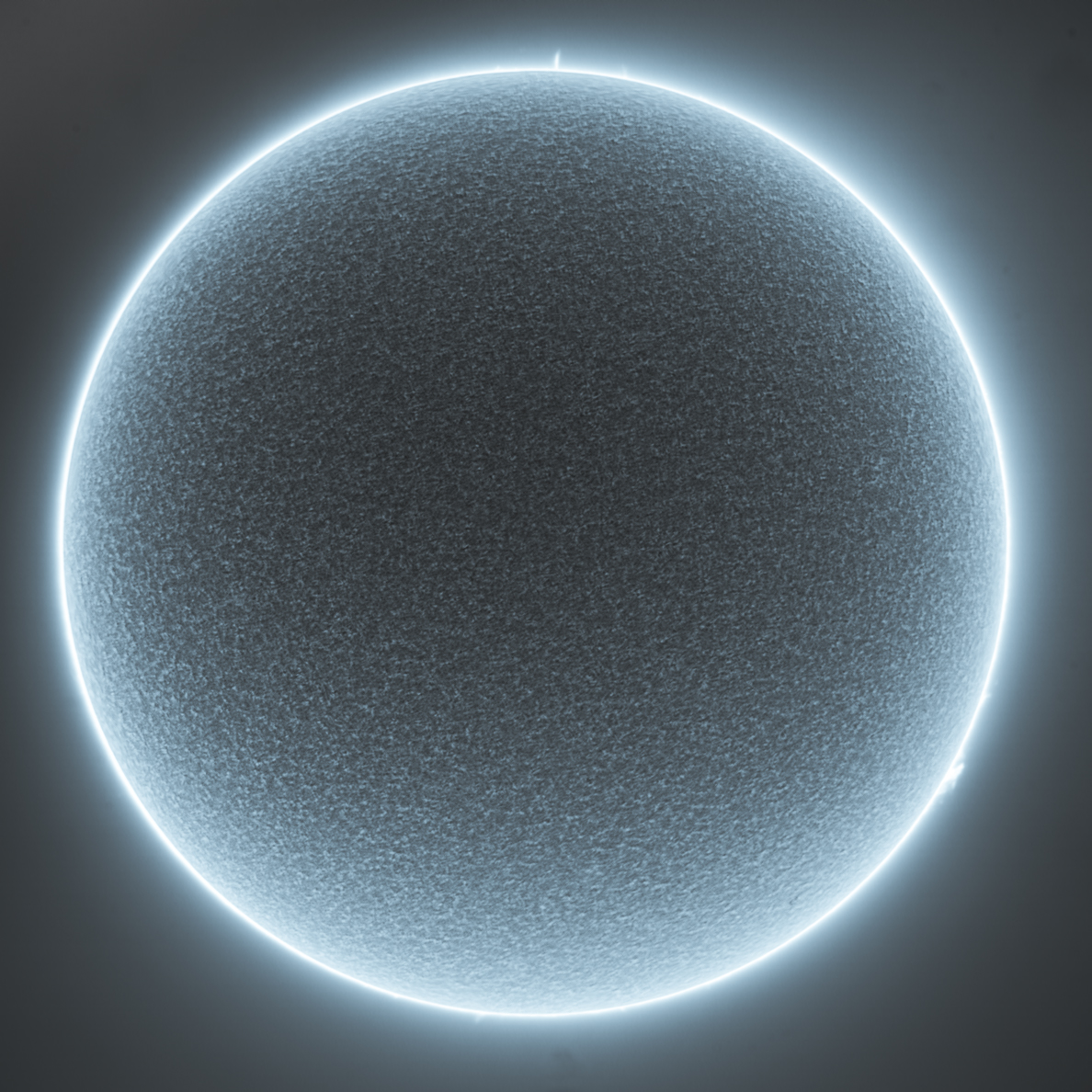 Il Sole ripreso nella banda H-alpha, in evidenza la cromosfera e alcune protuberanze. Il telescopio utilizzato è il Coronado Solarmax 70 III SS, la camera è una QHY5III 174 mono, una barlow 2x Celstron, il tutto su una montatura Skywatcher AZ-EQ6. L’acquisizione è stata effettuata utilizzando il software SharpCap 3, lo stacking attraverso Autostakkert 3, in ultimo per il fotoritocco ho utilizzato Adobe Photoshop 2019 CC.