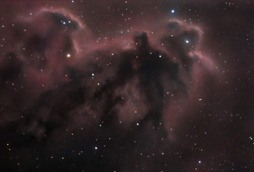 Bella nebulosa oscura in Orione. Si tratta di una nebulosa oscura associata a piccole riflessioni e immersa nell’alone di idrogeno esterno dell’anello di Barnard , un soggetto che si è rivelato veramente ostico dai luminosi cieli di Roma, comunque dopo diverse notti dedicate alla ripresa con il filtro Ha da 6 nm qualcosa è venuto fuori.