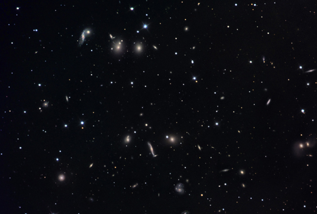 Ammasso di galassie in Ercole. E’ un ammasso di galassie molto distante in Ercole , infatti il campo è circa 21’x14′ la magnitudine delle galassie va da circa 13,8 per le più luminose fino alla 18esima e oltre per le più piccole , ripresa con il trans 12″ ridotto a f8 , un totale di 58 frame da 600 sec. in bin 1×1 , colore RGB 8+8+15 frame da 200 sec. cad. in bin 3×3. Seeing medi 3.4 la prima sera 2.9 la seconda , 3.2 la terza.