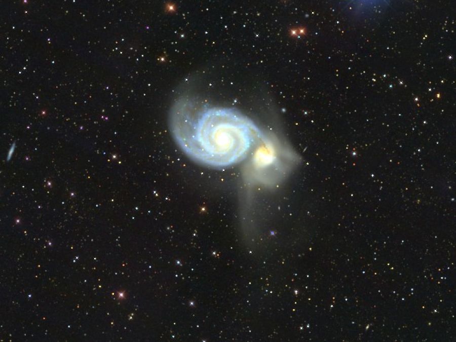 M51 e NGC 5195 galassie interagenti nella costellazione dei Cani Venatici distanti 25 milioni di anni luce. Senza alcun dubbio l’oggetto cosmico più bello che io ho visto tramite oculare del telescopio: la sua bellezza è talmente straordinaria da lasciare a bocca aperta! Nello scatto rielaborato con lightroom è visibile a sinistra la galassia IC 4263.
