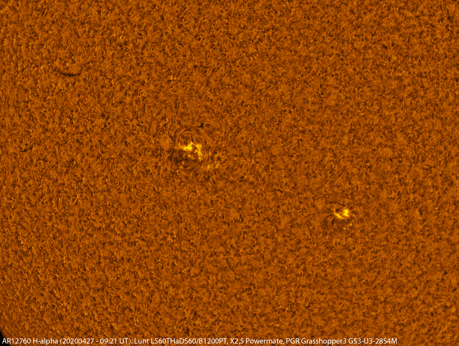 Regione attiva AR 12760 in H-Alpha. Lunt LS60THaDS60/B1200PT, Tele Vue Powermate 2,5x, camera PGR Grasshopper3 GS3-U3-28S4M.