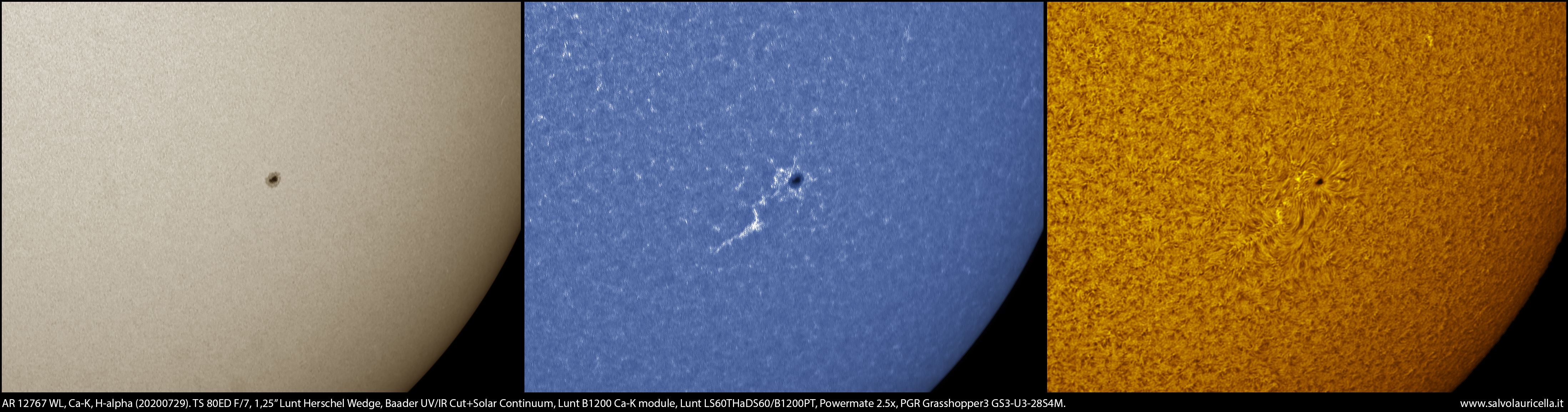 Regione attiva AR 12767 ripresa in tre diverse lunghezze d’onda: luce bianca, Ca-K e H-alpha.