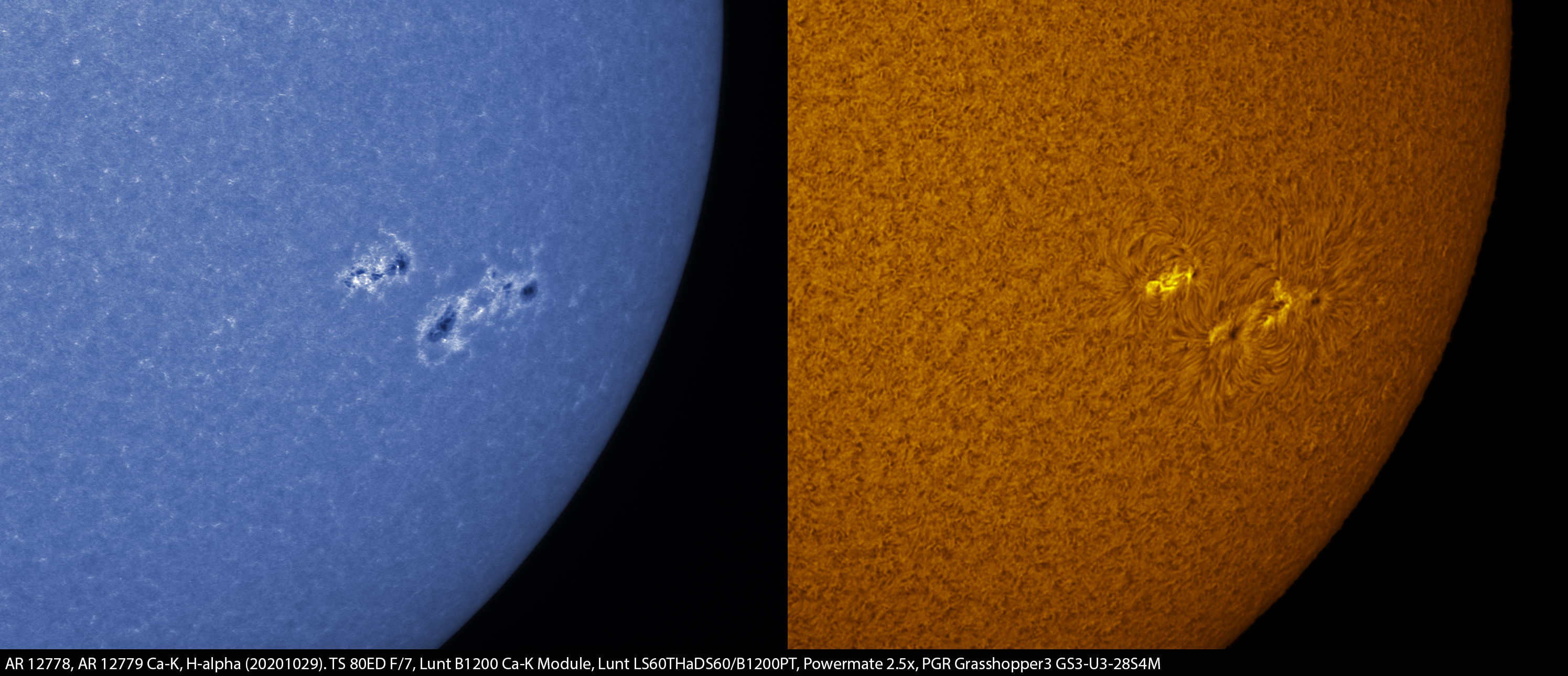 Regioni attive AR 12778 e AR 12779 riprese in Ca-K e H-alpha