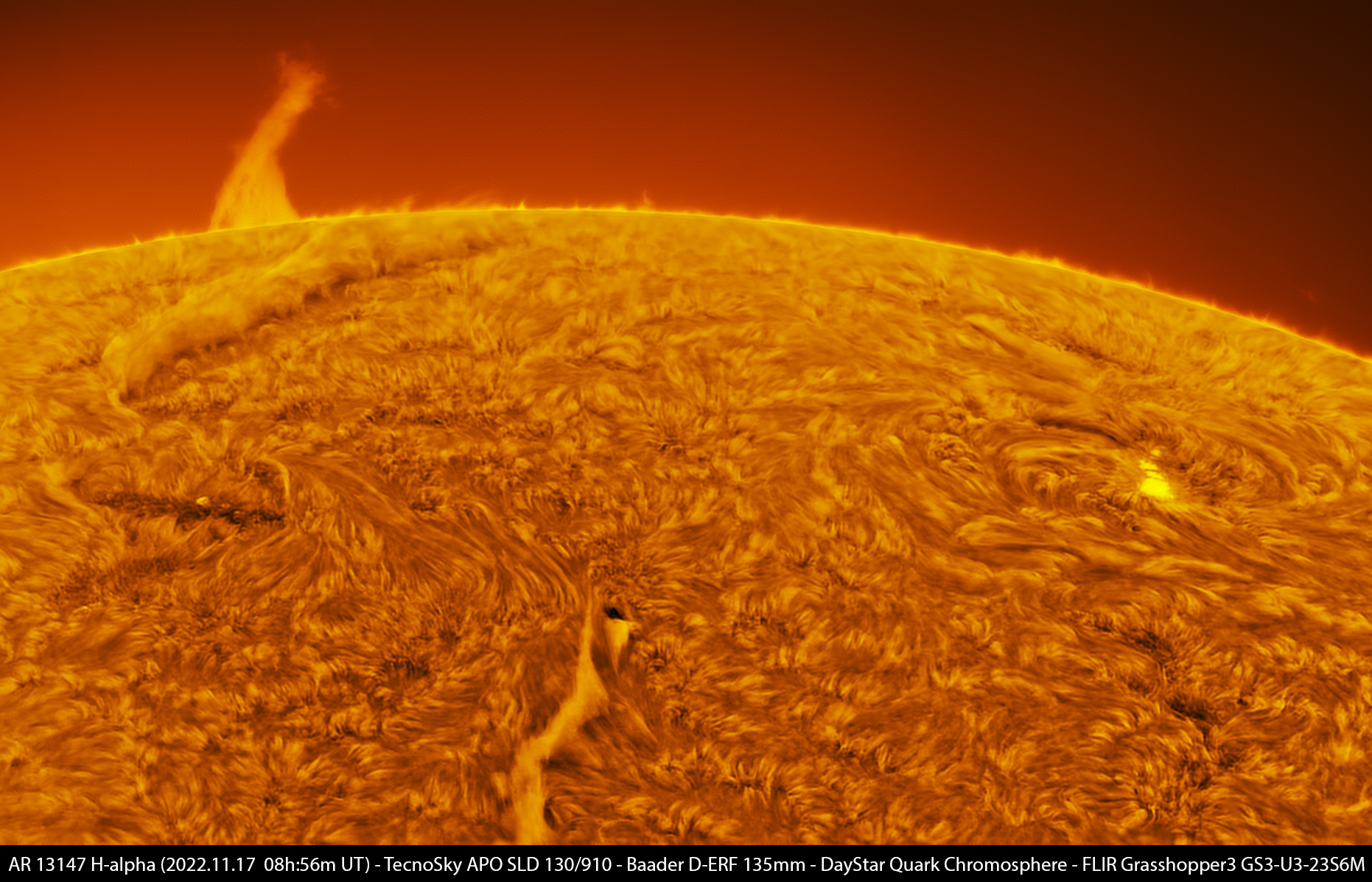 Protuberanza solare ripresa in H-alpha; sullo sfondo è visibile la regione attiva 13147. Strumentazione usata: Tecnosky APO SLD 130/910, Baader D-ERF 135mm, DayStar Quark Chromosphere, camera FLIR Grasshopper3 GS3-U3-23S6M