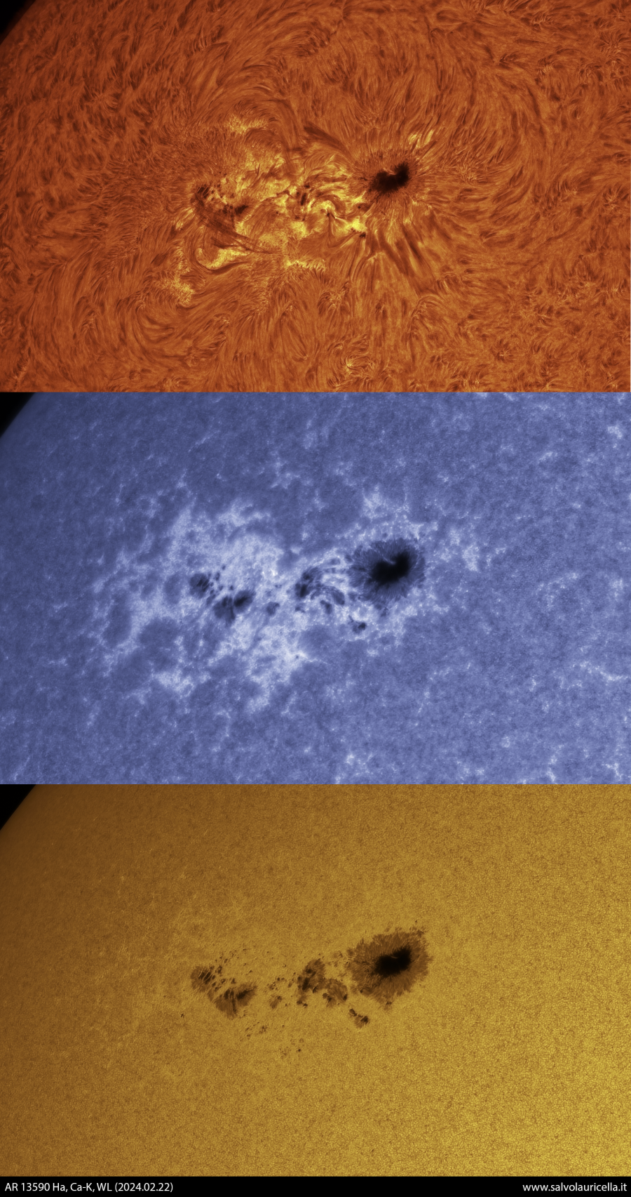 Regione attiva 13590 ripresa in H-alfa, Ca-K e in luce bianca