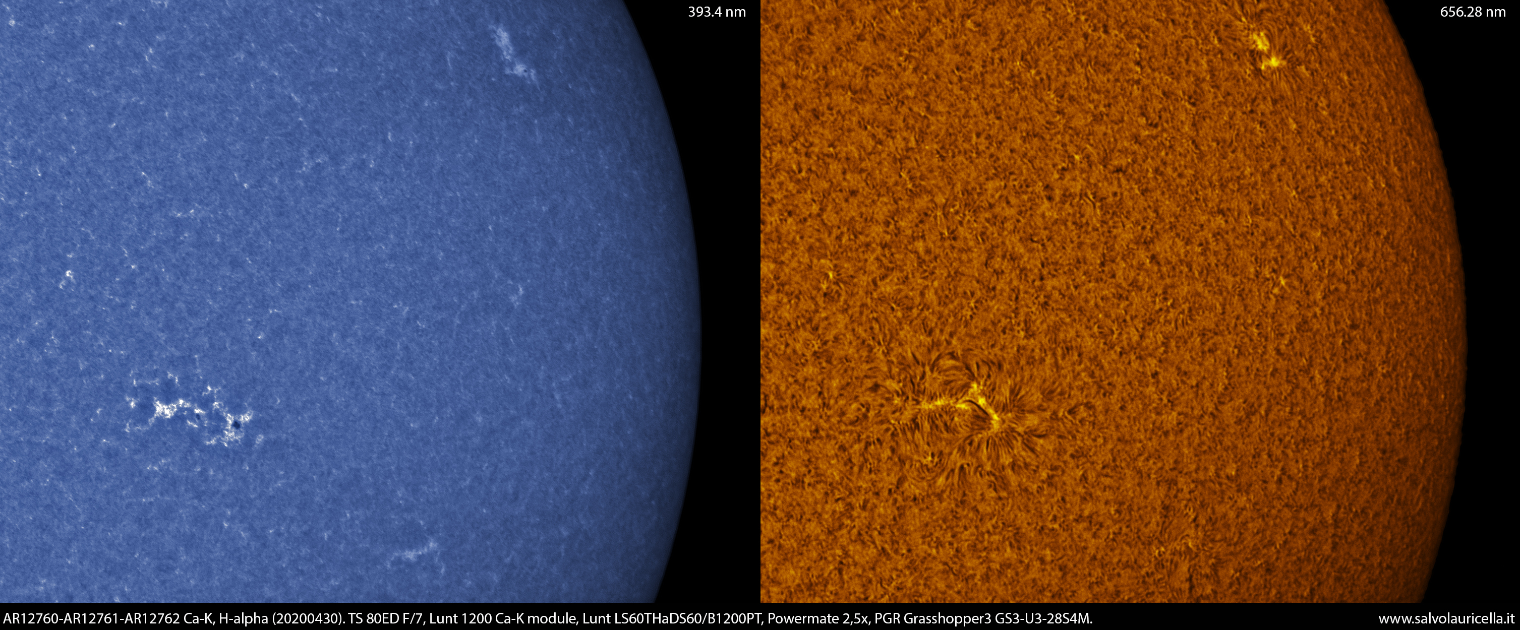 Regioni attive AR12760-AR12761-AR12762 riprese nella riga Ca-K e H-Alpha. TS 80ED F/7, Lunt modulo Ca-K B1200, Lunt LS60THaDS60/B1200PT, Powermate 2,5x, camera PGR Grasshopper3 GS3-U3-28S4M.