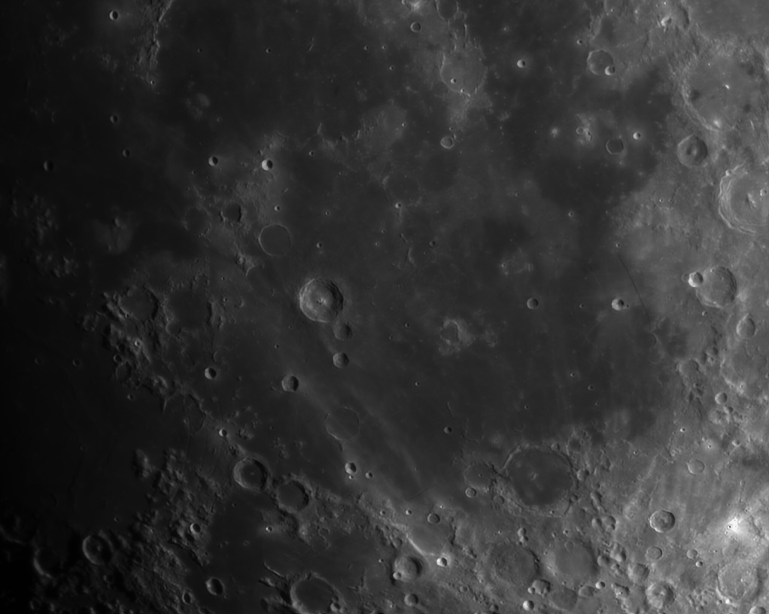 Cratere Bullialdus e dintorni. TecnoSky APO SLD 130/900, Tele Vue Powermate 2,5x, Baader IR-Pass, camera PGR Grasshopper3 GS3-U3-28S4M