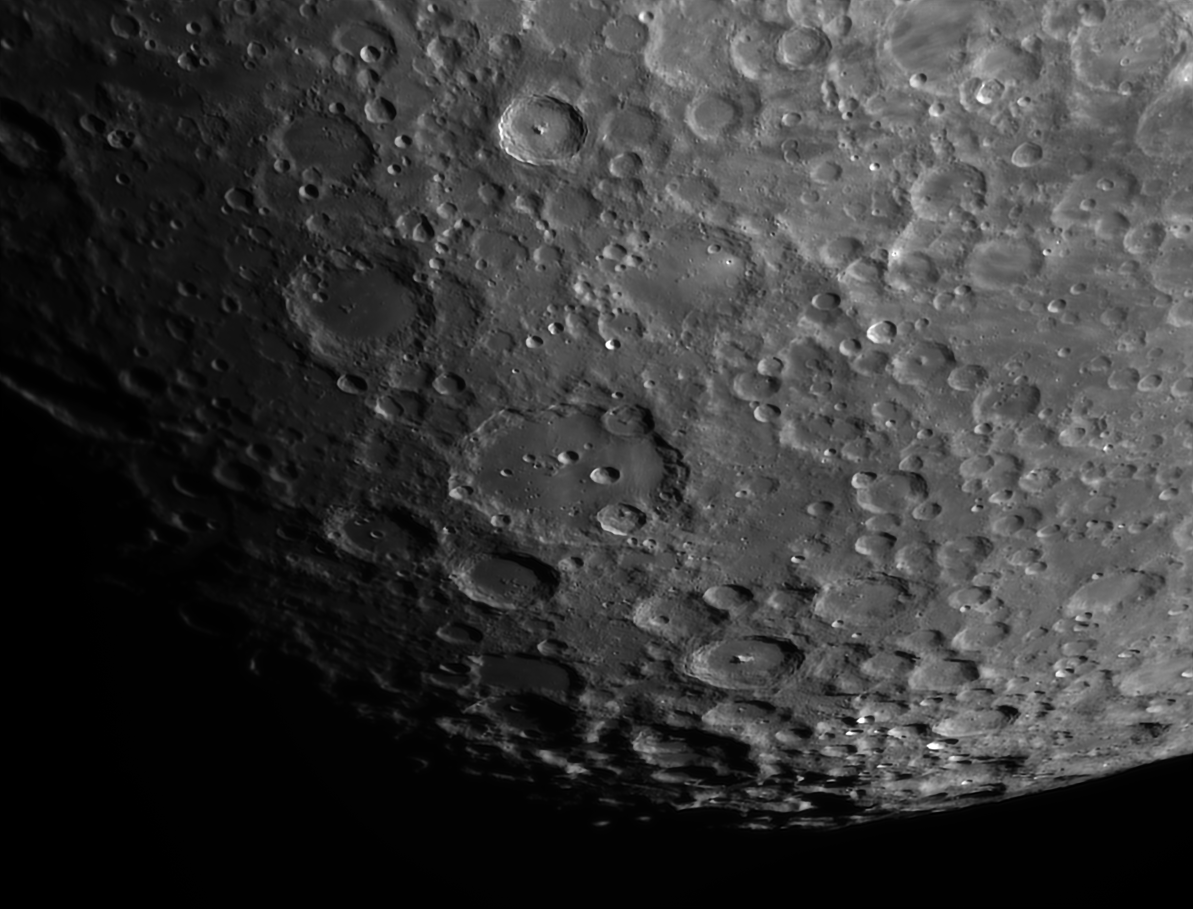 Cratere Clavius e dintorni. TecnoSky APO SLD 130/900, Tele Vue Powermate 2,5x, Baader IR-Pass, camera PGR Grasshopper3 GS3-U3-28S4M.