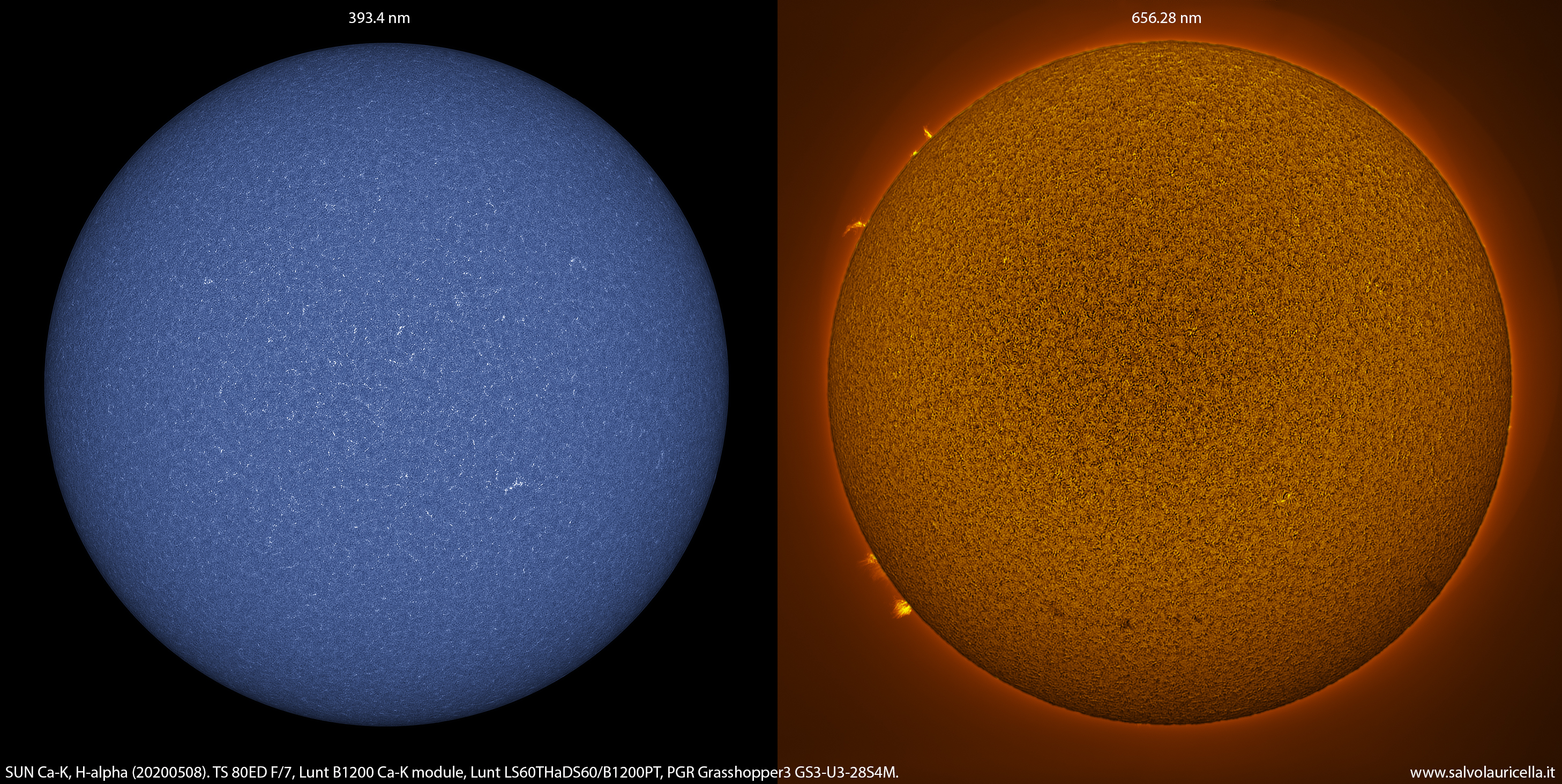 Disco solare ripreso nella banda Ca-K e H-alpha. TS 80ED F/7, Lunt modulo Ca-K B1200, Lunt LS60THaDS60/B1200PT, camera Point Grey Grasshopper3 GS3-U3-28S4M
