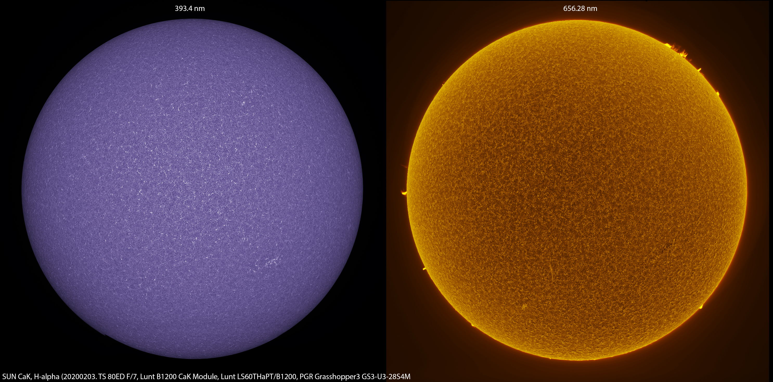 Confronto tra due riprese del Sole, una nella riga CaK, l’altra in H-Alpha.