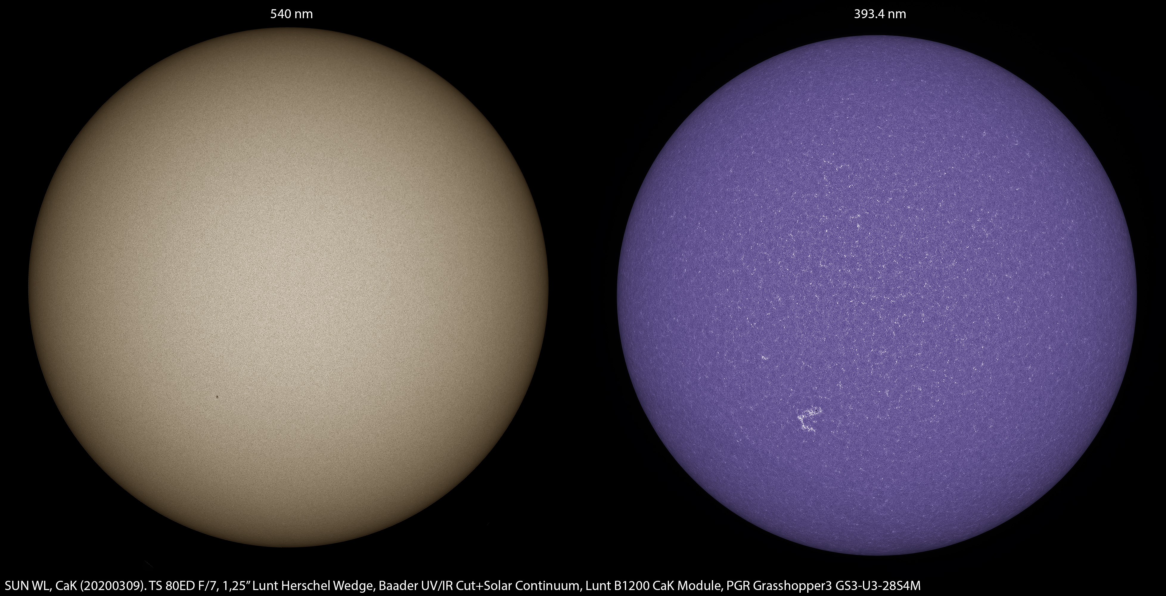 Confronto tra due immagini del Sole riprese in luce bianca e nella riga CaK. Rifrattore TS 80ED F/7 con prisma di Herschel Lunt 1,25" e filtri Baader UV/IR-Cut e Solar Continuum per l’immagine in luce bianca; Lunt modulo CaK B1200 per l’immagine in CaK. Camera PGR Grasshopper3 GS3-U3-28S4M.
