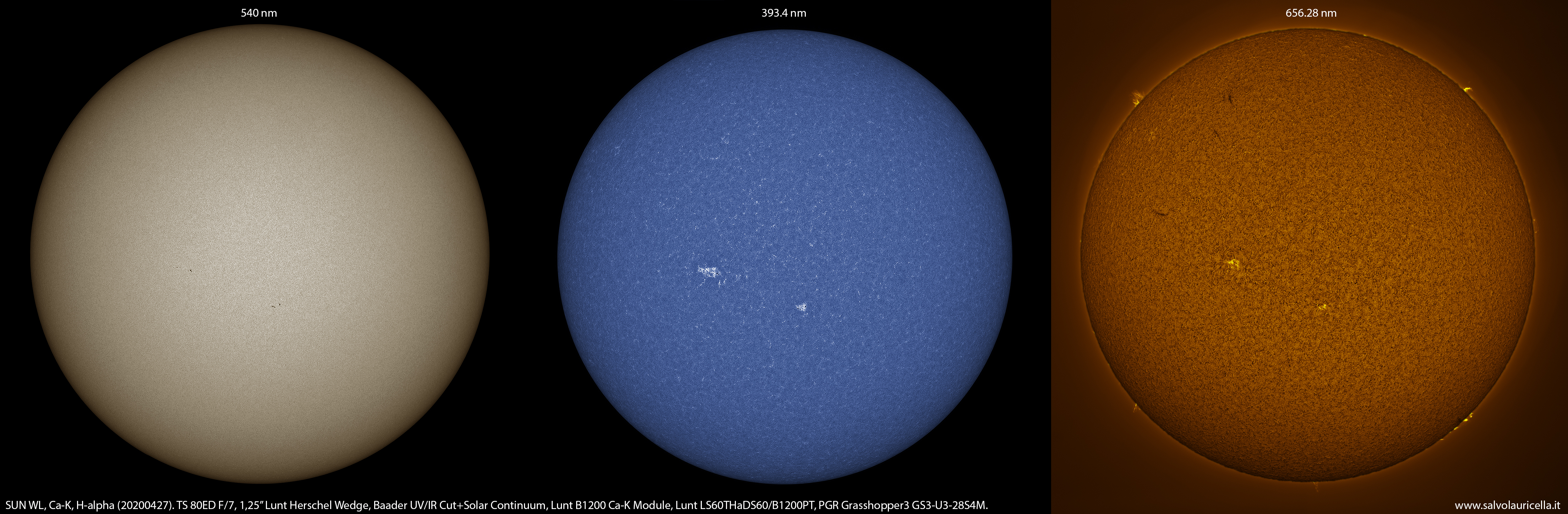Sole ripreso in luce visibile, Ca-K e H-Alpha. TS 80ED F/7, Lunt prisma di Herschel, Baader UV/IR Cut+Solar Continuum, Lunt modulo Ca-K B1200, Lunt LS60TADS60/B1200PT, camera Grasshopper3 GS3-U3-28S4M.