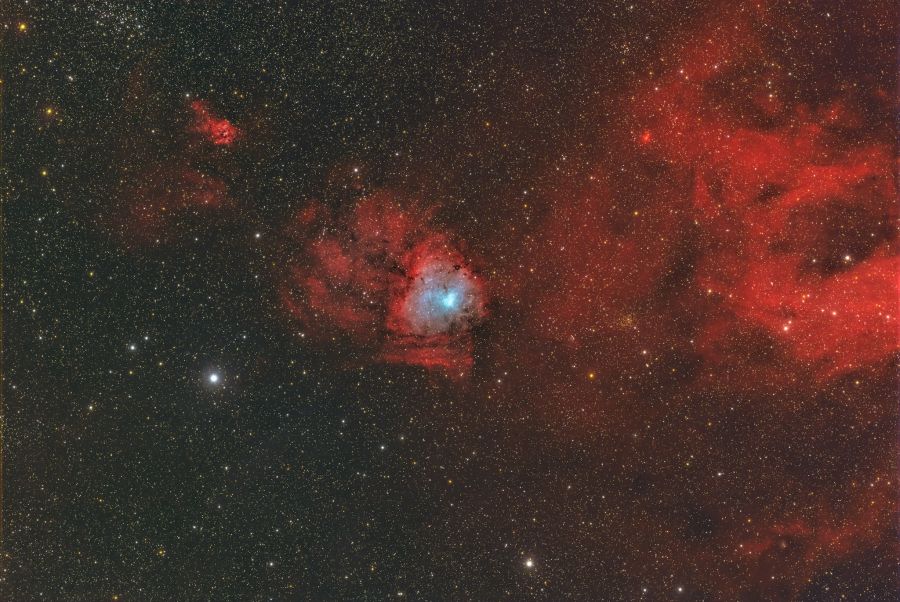 Nebulosa a emissione scoperta da William Herschel nel 1790 e appartenente alla costellazione di Perseo. Distante da noi circa 11.500 anni luce è possibile vederla grazie al potere ironizzante di una stella ad altissima temperatura, presente al suo interno