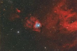 La nebulosa tulipano è una nebulosa ad emissione individuabile nella Costellazione del Cigno e catalogata da Sharpless nel 1959 al numero 101. Si estende per 70 anni luce e dista dalla Terra 2683 Parsec. In alto a destra è visibile l’onda d’urto provocata dal microquasar Cygnus x-1, anch’esso visibile in foto, e fonte dei più forti raggi X presenti nel cielo terrestre. L’onda d’urto e la sua sorgente furono oggetto di una scommessa tra Sthephen Howking e Kip Thorne nel 1974. Howking sosteneva infatti che la sorgente non fosse un buco nero e dovette ammettere la sconfitta quando nel 1990 i dati osservativi confermarono la presenza del microquasar. L’acquisizione dei dati è avvenuta nelle notti di luna nuova di Luglio da Castelfidardo (AN), da Palermo e da Piano Battaglia , riserva naturale nel parco delle madonie per un totale di 36H con scatti da 300 e 600sec. Elaborata in HOO