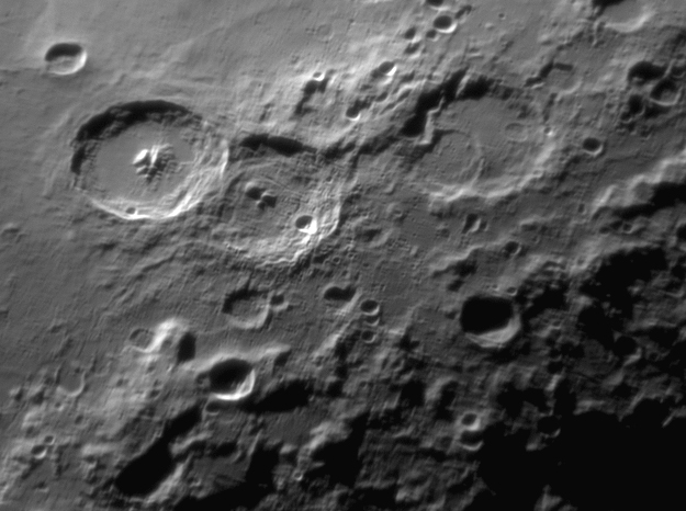 I Crateri Theophilus, Cyrillus e Catarina ripresi con un Maksutov Cassegrain Zen 25 cm e telecamera Imaging source Bn . Somma di 132 frames. Forte turbolenza. Ripresi dall’Agriturismo Torredoganiera di Pievescola (Si) S. Gasparini. Sito: www.astrobook.it