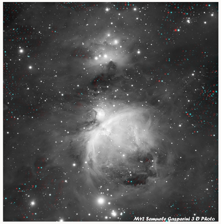 Ho realizzato una serie di immagini come esperimento applicando la tecnica per la realizzazione di immagini 3D ad immagini astronomiche, in questo caso ad una mia immagine di luminanza ripresa l’anno scorso di M42 con lo Skywacher 80 ed e la Moravian G2-4000. La foto va vista con i classici occhialini anaglifici Rosso-Ciano per ottenere una cartolina effetto 3D. S. Gasparini www.astrobook.it