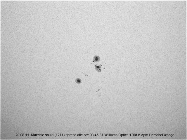 Gruppo di Macchie riprese questa mattina con un Rifrattore Williams Optics 120Ed e Prisma di Herschel Apm con filtro Baader 3.0 più filtro polarizzatore. 188 frames con Immaging Source B/N. Sito internet personale www.astrobook.it Sito del gruppo: www.circoloastrofilibetelgeuse.it