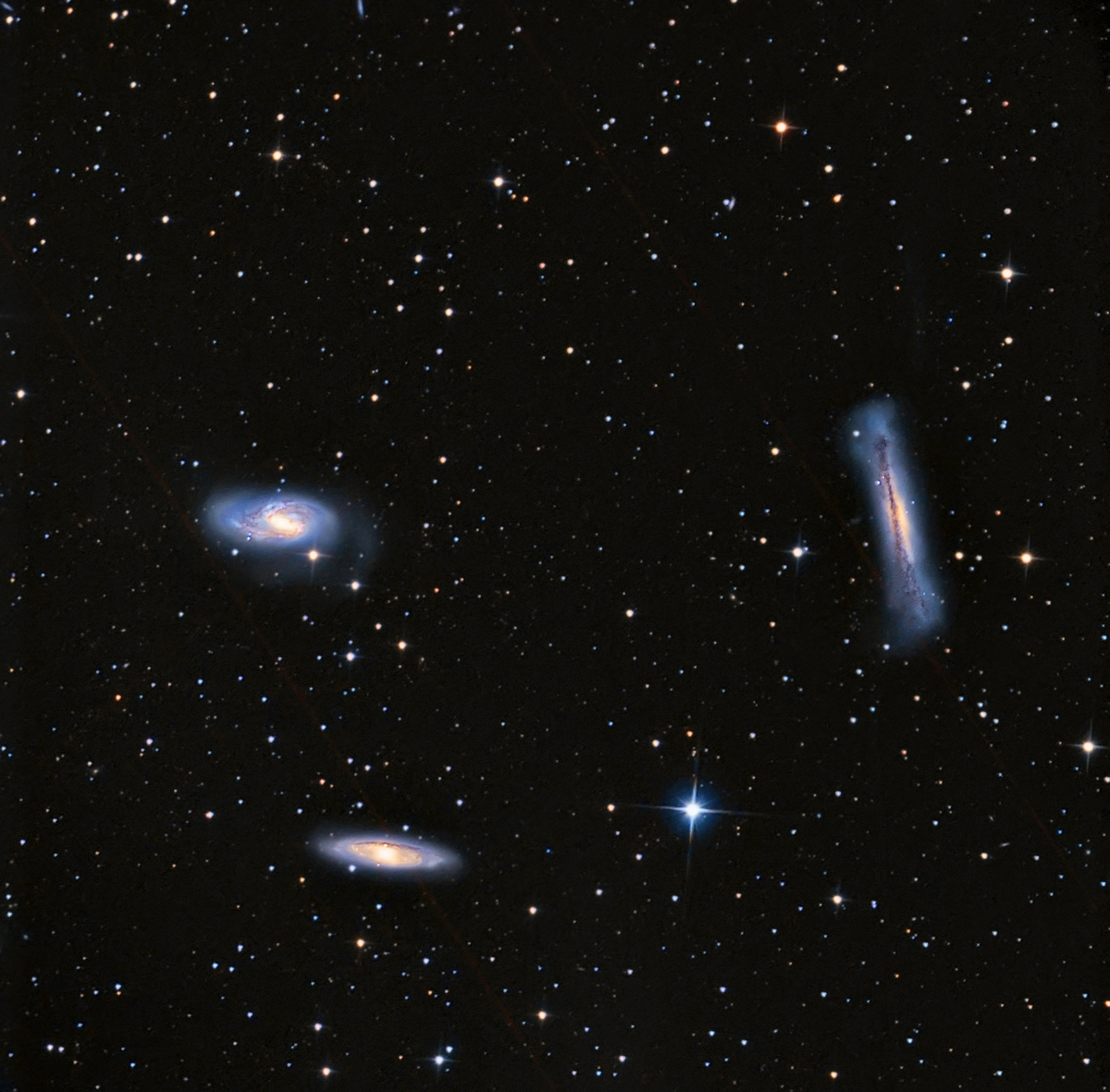 Le galassie M66 -M65-Ngc 3628 riprese con il Boren Simon da 20 cm a F/ 3.9. Somma di 60 min di L e 40 minuti per ciascun canale R-G-B. Camera Moravian G2-4000 a -25°. Luogo di Ripresa "Agriturismo Torre Doganiera" di Pievescola (Si) S. Gasparini. Foto pubblicata in full resolution su: www.astrobook.it