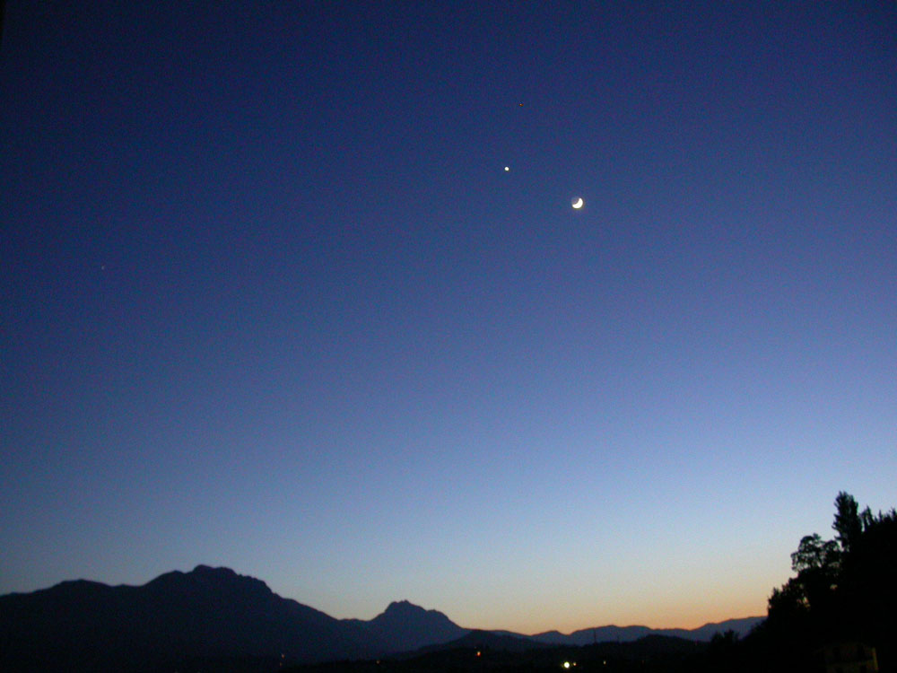 LUNA VENERE TRAMONTANO. A BRACCIETTO LUNA E VENERE SCOMPAIONO DIETRO LE DUE PERLE DEL GRAN SASSO;