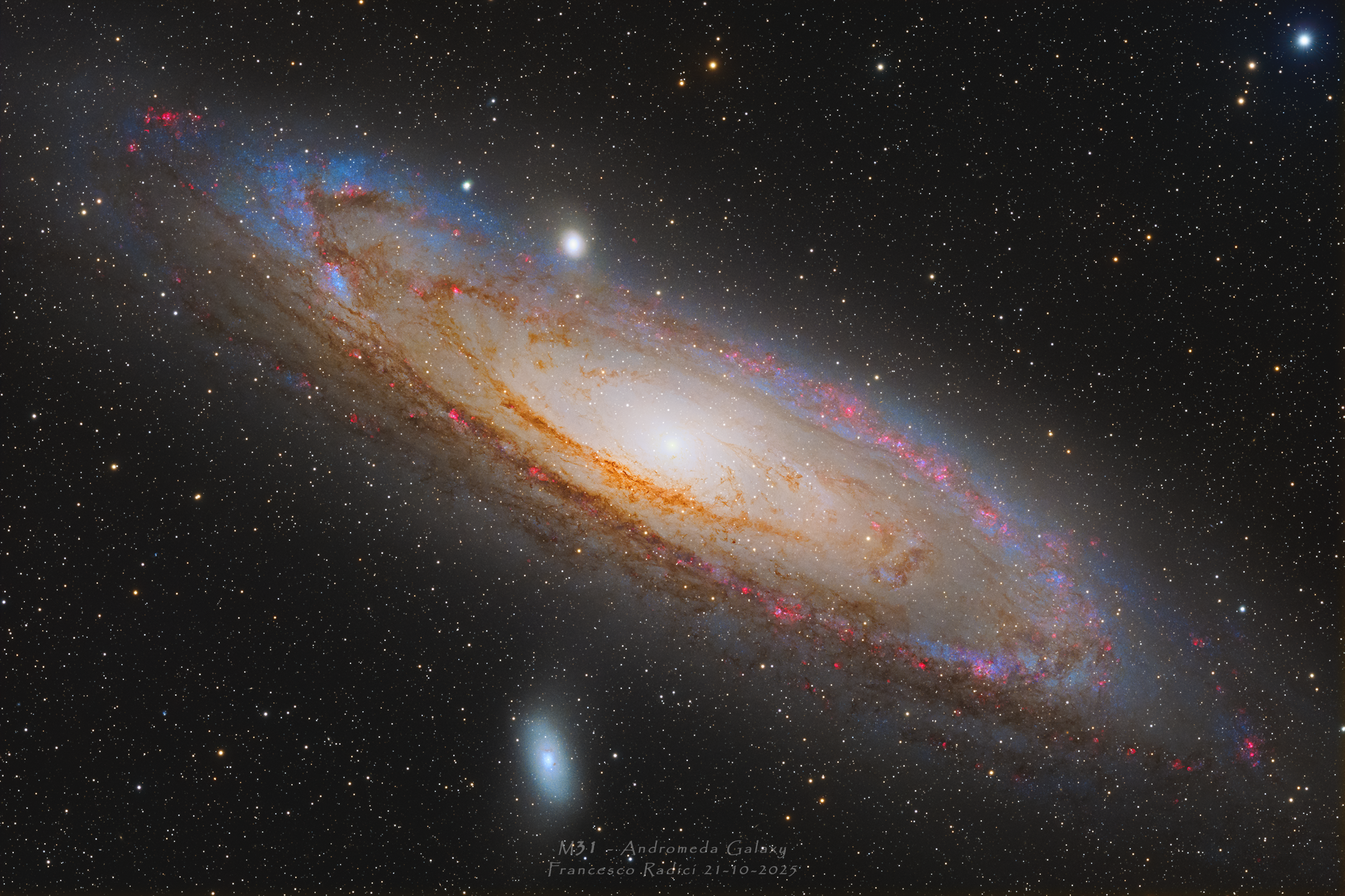 In tutto il suo splendore, ecco la nostra “vicina di casa”, la galassia di Andromeda. Con i suoi 2,5 milioni di anni luce di distanza, si tratta dell’oggetto più lontano osservabile ad occhio nudo sotto cieli bui, come quello di Pietralunga, da cui l’ho ripresa lo scorso sabato. Così luminosa ed evidente nei cieli incontaminati dell’antichità che ne fa cenno già l’astronomo persiano Abd al-Rahman al-Sufi (Azophi) nel suo “Libro delle stelle fisse” del 964 d.c. descrivendola come una “piccola nube”. E fino a tempi ben più recenti, infatti, M31 veniva chiamata la “Nebulosa di Andromeda”, la sua vera natura galattica infatti è stata svelata soltanto nel 1923/24 dall’astronomo Edwin Hubble che, utilizzando il telescopio da 100 pollici di Monte Wilson, individuò cefeidi variabili all’interno di M31. Misurando la loro distanza, dimostrò che l’oggetto era ben oltre i confini della Via Lattea, si trattava cioè una galassia indipendente, la prima mai scoperta! Questa eccezionale rivelazione cambiò per sempre la nostra visione dell’universo: per la prima volta si capì che la Via Lattea non è l’unica galassia esistente. Oggi sappiamo molte più cose sull’Universo e sulla miriade di galassie al di fuori della nostra, sappiamo anche che M31 fa parte, con la Via Lattea, M33 e circa una cinquantina di altre, del cosiddetto “Gruppo Locale”, un insieme di galassie legate gravitazionalmente, di cui proprio M31, la più grande, è, per così dire, il fulcro gravitazionale. M31 è quindi molto legata a noi e alla nostra Via Lattea, e lo sarà sempre di più, dal momento che le due “compagne” si stanno avvicinando alla vertiginosa velocità di 110 Km al secondo, tanto che un giorno le due collideranno andando a fondersi in un’unica immensa galassia ellittica. Ma possiamo dormire sonni tranquilli, se ne parlerà tra circa 4 miliardi di anni. Oltre alla maestosa M31, ed alle sue nebulose, nella foto si possono vedere le sue due galassie satelliti, M32 ed M110, che le orbitano attorno. Equipment: Skywatcher Esprit 100 ED Omegon veTEC571C Color Antlia ALP-T 5nm Dual Band Filter Touptek OAG X + ASI290MM Mini Guide Camera Ioptron CEM70