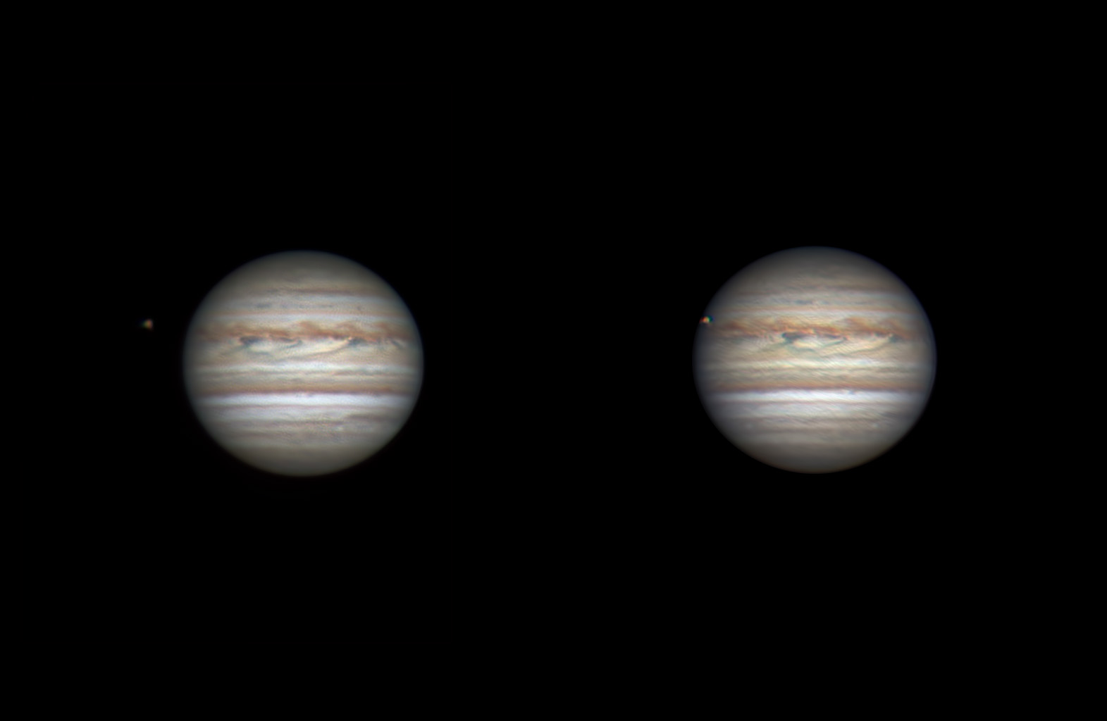 Due riprese in LRGB rispettivamente prima ed inizio del transito del satellite mediceo Io sul disco gioviano. Ripesa effettuata al primo fotogramma alle ore 20:37 T.U. ed il secondo effettuata alle 21:06 T.U.